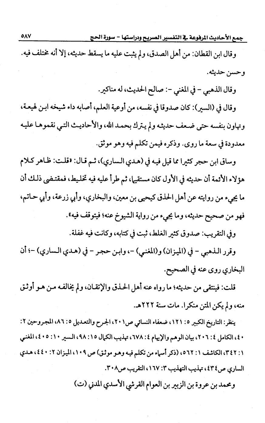 ينظر: التاريخ الكبير 5: 121، ضعفاء النسائي ص 201، الجرح والتعديل 5: 86، المجروحين 2: 40، الكامل 4: 206، بيان الوهم والإيهام 4: 678، تهذيب الكمال 15: 98، السير 10: 405، المغني 1: 342، الكاشف 1: 562، (ذكر أساء من تكلم فيه وهو موثق) ص 109، الميزان 2: 440، هدي الساري ص 434، تهذيب التهذيب 3: 167، التقريب ص 308.