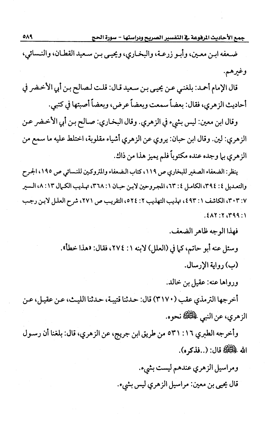 وقال ابن معين: ليس بشيء في الزهري. وقال البخاري: صالح بن أبي الأخضر عن الزهري: لين. وقال ابن حبان: يروي عن الزهري أشياء مقلوبة، اختلط عليه ما سمع من الزهري بما وجده عنده مكتوبًا فلم يميز هذا من ذاك.