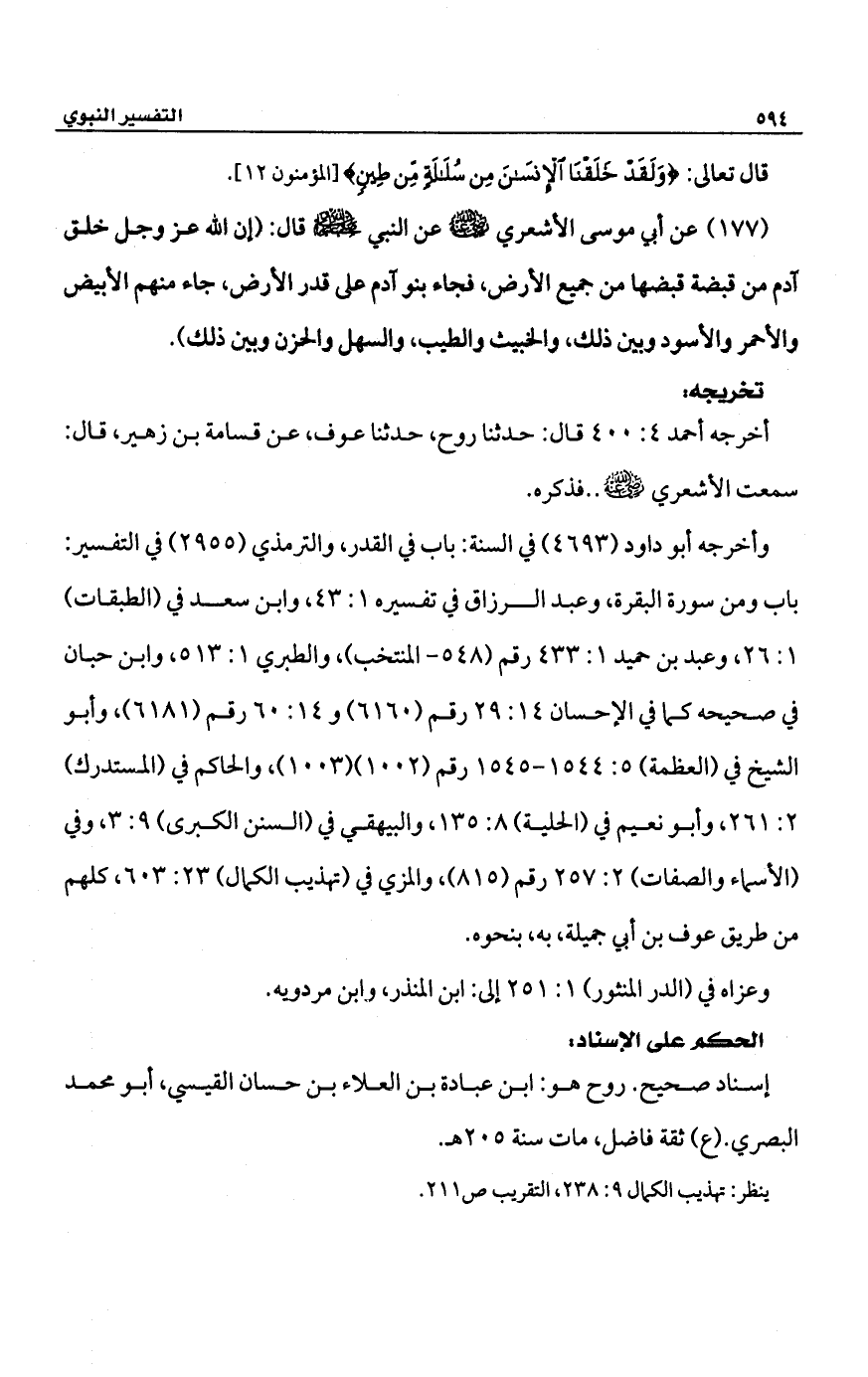 (177) عن أبي موسى الأشعري -رضي الله عنه- عن النبي -صلى الله عليه وسلم- قال: (إن الله عز وجل خلق آدم من قبضة قبضها من جميع الأرض، فجاء بنو آدم على قدر الأرض، جاء منهم الأبيض والأحمر والأسود وبين ذلك، والخبيث والطيب، والسهل والحزن وبين ذلك).