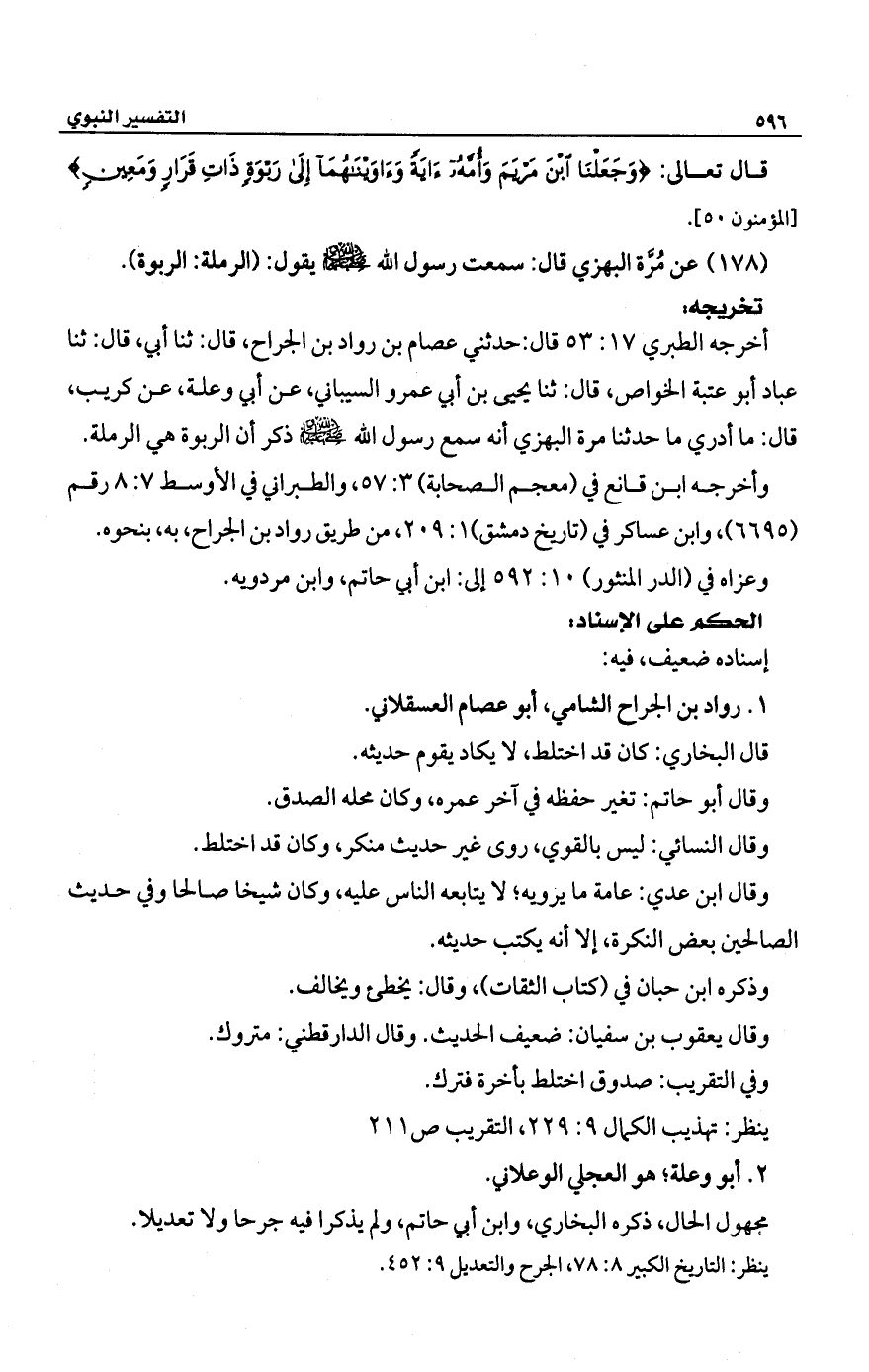 أخرجه الطبري 17: 53 قال: حدثني عصام بن رواد بن الجراح، قال: ثنا أبي، قال: ثنا عباد أبو عتبة الخواص، قال: ثنا يحيى بن أبي عمرو السيباني، عن أبي وعلة، عن كريب، قال: ما أدري ما حدثنا مرة البهزي أنه سمع رسول الله -صلى الله عليه وسلم- ذكر أن الربوة هي الرملة.