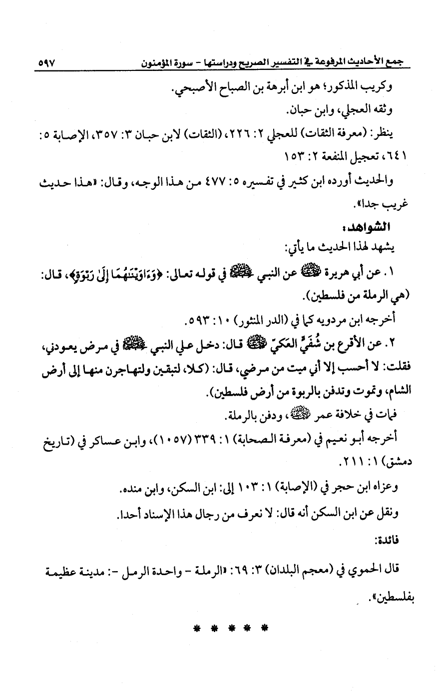 1 - عن أبي هريرة -رضي الله عنه- عن النبي -صلى الله عليه وسلم- في قوله تعالى: {وَآوَيْنَاهُمَا إِلَى رَبْوَةٍ}، قال: (هي الرملة من فلسطين).