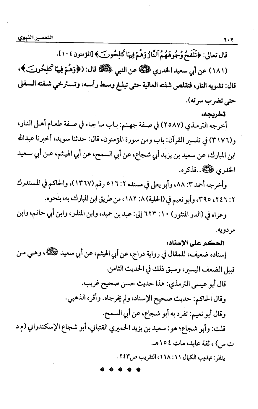 (181) عن أبي سعيد الخدري -رضي الله عنه- عن النبي -صلى الله عليه وسلم- قال: {وَهُمْ فِيهَا كَالِحُونَ}، قال: تشويه النار، فنقلص شفته العالبة حتى تبلغ وسط رأسه، وتسترخي شفته السفلى حتى تضرب سرته).