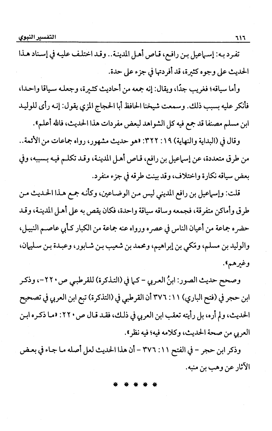 وقال في (البداية والنهاية) 19: 322: "هو حديث مشهور، رواه جماعات من الأئمة .. من طرق متعددة، عن إسماعيل بن رافع، قاص أهل المدينة، وقد تكلم فيه بسببه، وفي بعض سياقه نكارة واختلاف، وقد بينت طرقه في جزء منفرد.