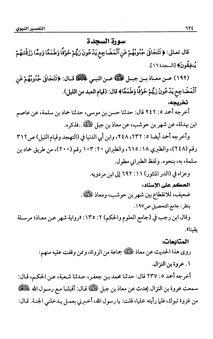 (192) عن معاذ بن جبل -رضي الله عنه- عن النبي -صلى الله عليه وسلم- قال: {تَتَجَافَى جُنُوبُهُمْ عَنِ الْمَضَاجِعِ يَدْعُونَ رَبَّهُمْ خَوْفًا وَطَمَعًا} قال: (قيام العبد من الليل).