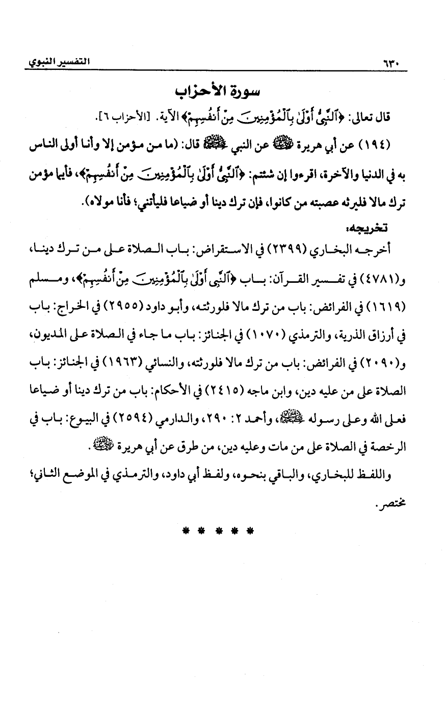 (194) عن أبي هريرة -رضي الله عنه- عن النبي -صلى الله عليه وسلم- قال: (ما من مؤمن إلا وأنا أولى الناس به في الدنيا والآخرة، اقرءوا إن شئتم: {النَّبِيُّ أَوْلَى بِالْمُؤْمِنِينَ مِنْ أَنْفُسِهِمْ}، فأيما مؤمن ترك مالا فليرثه عصبته من كانوا، فإن ترك دينا أو ضياعا فليأتني؛ فأنا مولاه).