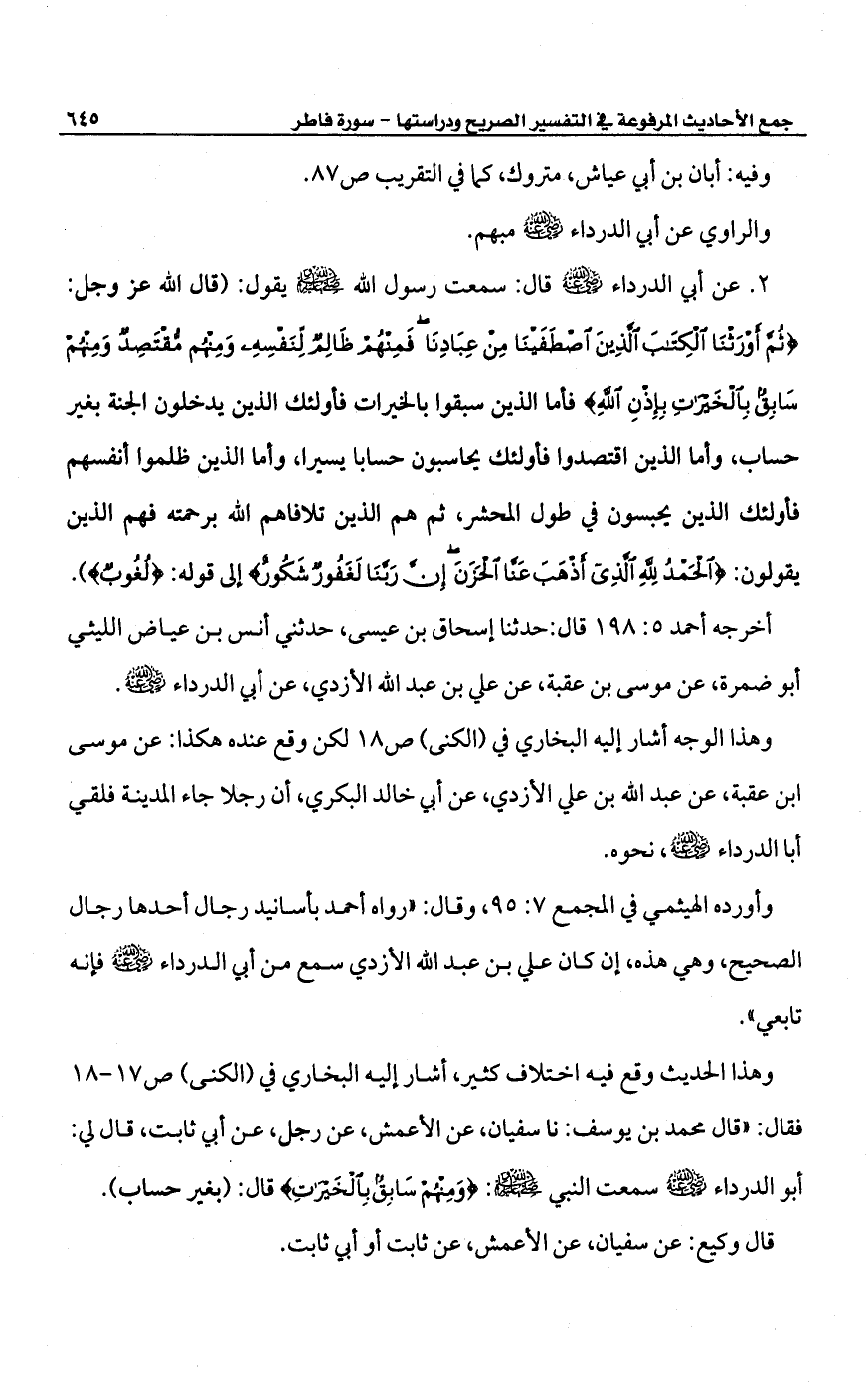 2 - عن أبي الدرداء -رضي الله عنه- قال: سمعت رسول الله -صلى الله عليه وسلم- يقول: (قال الله عز وجل: {ثُمَّ أَوْرَثْنَا الْكِتَابَ الَّذِينَ اصْطَفَيْنَا مِنْ عِبَادِنَا فَمِنْهُمْ ظَالِمٌ لِنَفْسِهِ وَمِنْهُمْ مُقْتَصِدٌ وَمِنْهُمْ سَابِقٌ بِالْخَيْرَاتِ بِإِذْنِ اللَّهِ} فأما الذين سبقوا بالخيرات فاولئك الذين يدخلون الجنة بغير حساب، وأما الذين اقتصدوا فأولئك يحاسبون حسابا يسيرا، وأما الذين ظلموا أنفسهم فأولئك الذين بحبسون في طول المحشر، ثم هم الذين تلافاهم الله برحمته فهم الذين يقولون: {الْحَمْدُ لِلَّهِ الَّذِي أَذْهَبَ عَنَّا الْحَزَنَ إِنَّ رَبَّنَا لَغَفُورٌ شَكُورٌ} إلى قوله: {لُغُوبٌ}).