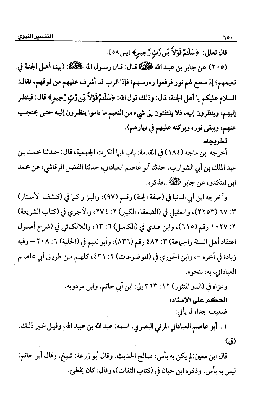 (205) عن جابر بن عبد الله -رضي الله عنهما- قال: قال رسول الله -صلى الله عليه وسلم-: (بينا أهل الجنة في نعيمهم؛ إذ سطع لهم نور فرفعوا رءوسهم؛ فإذا الرب قد أشرف عليهم من فوقهم، فقال: السلام عليكم يا أهل الجنة، قال: وذلك قول اله: {سَلَامٌ قَوْلًا مِنْ رَبٍّ رَحِيمٍ}، قال: فينظر إليهم، وينظرون إليه، فلا يلتفتون إلى شيء من النعيم ما داموا ينظرون إليه حتى يحتجب عنهم، ويبقى نوره وبركته عليهم في ديارهم).