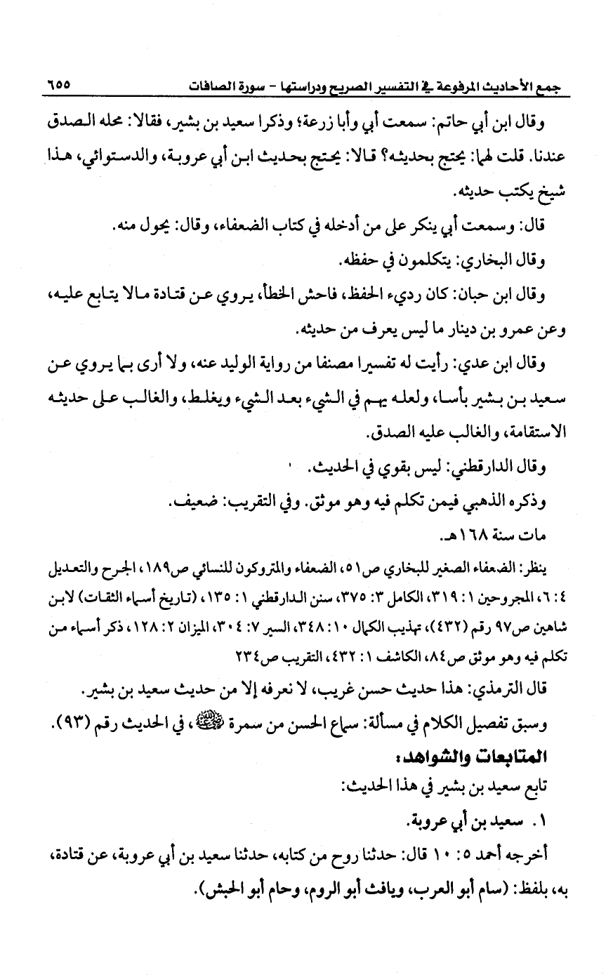 وقال ابن أبي حاتم: سمعت أبي وأبا زرعة؛ وذكرا سعيد بن بشير، فقالا: محله الصدق عندنا. قلت لهما: يحتج بحديثه؟ قالا: يحتج بحديث ابن أبي عروبة، والدستوائي، هذا شيخ يكتب حديثه.