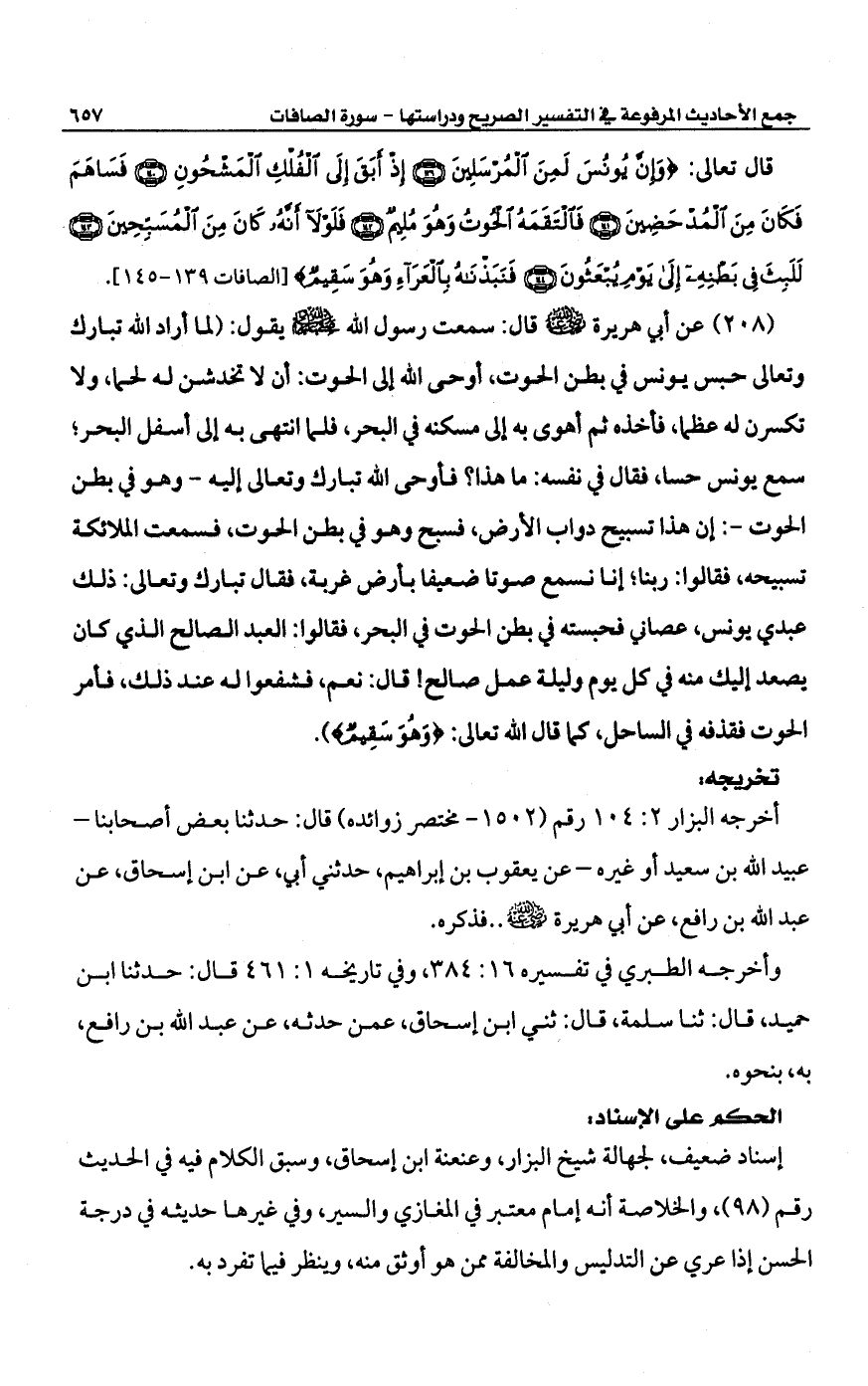 (208) عن أبي هريرة -رضي الله عنه- قال: سمعت رسول الله -صلى الله عليه وسلم- يقول: (لما ارأد الله تبارك وتعالى حبس يونس في بطن الحوت، أوحى الله ألى الحوت: أن لا تخدشن له لحما، ولا تكسرن له عظما، فأخده ثم أهوى به إلى مسكنه في البحر، فلما انتهى به إلى أسفل البحر؛ سمع يونس حسا، فقال في نفسه: ما هذا؟ فأوحى الله تبارك وتعالى إليه -وهو في بطن الحوت-: إن هذا تسببح دواب الأرض، فسبح وهو في بطن الحوت، فسمعت الملائكة تسببحه، فقالوا: ربنا؛ إنا نسمع صوتا ضعيفا بأرض غربة فقال تبارك وتعالى: ذلك عبدي يونس، عصاني فحبسته في بطن الحوت في البحر، فقالوا: العبد الصالح الذي كان يصعد إليك منه في كل يوم وليلة عمل صالح! فال: نعم، فشفعوا له عند ذلك، فأمر الحوت فقذفه في الساحل، كما قال الله تعالى: {وَهُوَ سَقِيمٌ}).