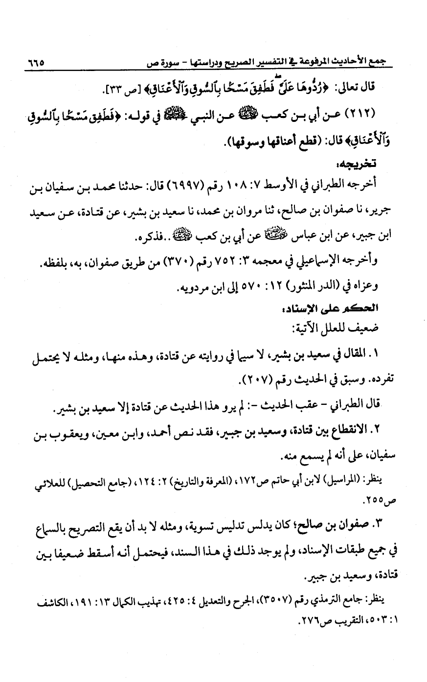 (212) عن أبي بن كعب -رضي الله عنه- عن النبي -صلى الله عليه وسلم- في قوله: {رُدُّوهَا عَلَيَّ فَطَفِقَ مَسْحًا بِالسُّوقِ وَالْأَعْنَاقِ} قال: (قطع أعنافها وسوقها).