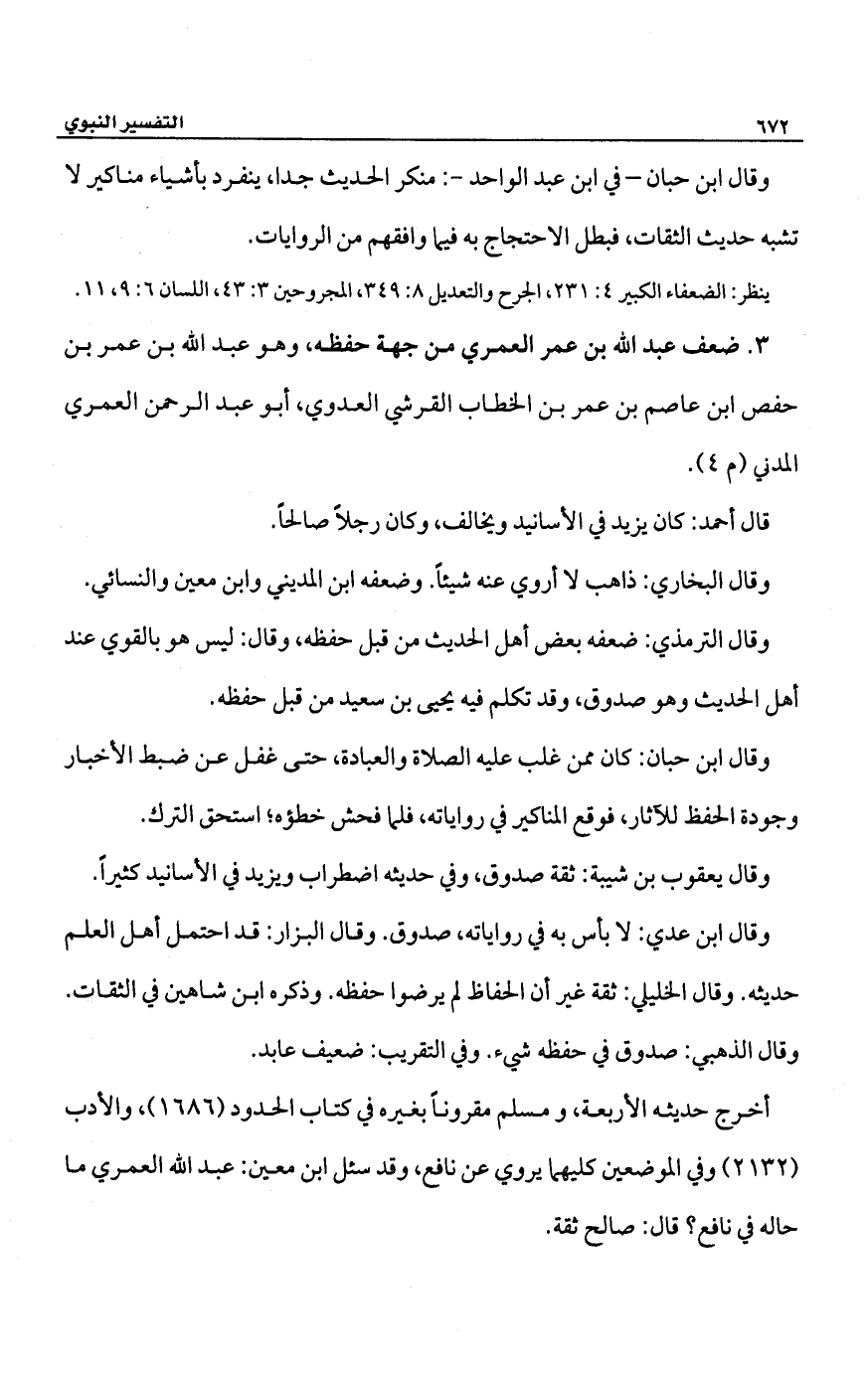 3 - ضعف عبد الله بن عمر العمري من جهة حفظه، وهو عبد الله بن عمر بن حفص ابن عاصم بن عمر بن الخطاب القرشي العدوي، أبو عبد الرحمن العمري المدني (م 4).