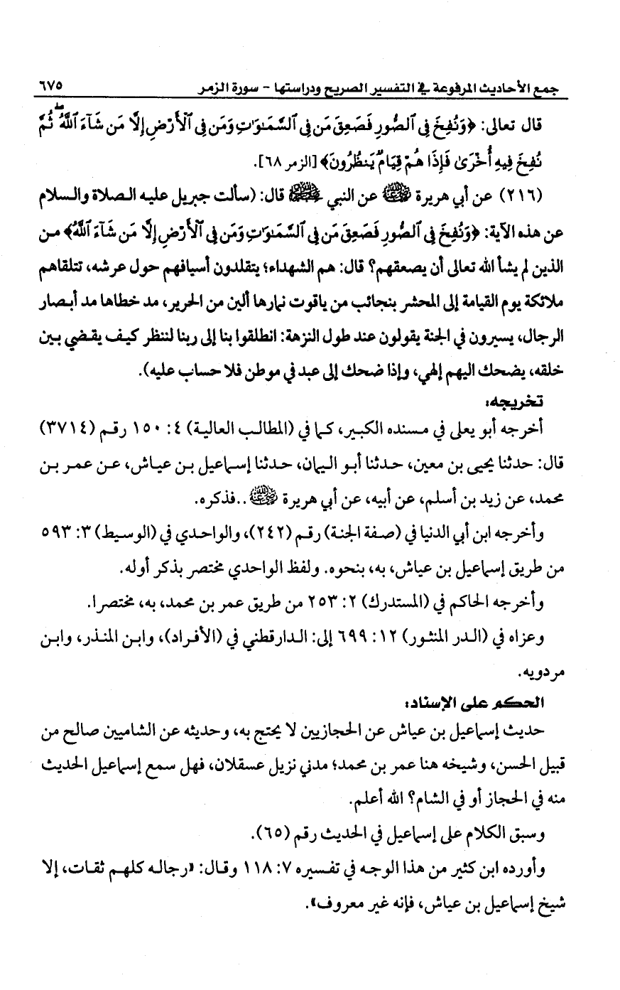(216) عن أبي هريرة -رضي الله عنه- عن النبي -صلى الله عليه وسلم- قال: (سألت جبريل عليه الصلاة والسلام عن هذه الآية: {وَنُفِخَ فِي الصُّورِ فَصَعِقَ مَنْ فِي السَّمَاوَاتِ وَمَنْ فِي الْأَرْضِ إِلا مَنْ شَاءَ اللَّهُ} من الذين لم يشأ الله تعالى أن يصعقهم؟ قال: هم الشهداء؛ يتقلدون أسيافهم حول عرشه، تتلقاهم ملائكة يوم القيامة إلى المحشر بنجائب من ياقوت نمارها ألين من الحرير، مد خطاها مد أبصار الرجال، يسيرون في الجنة يقولون عند طول النزهة: انطلقوا بنا إلى ربنا لننظر كليف يقضي بين خلقه، يضحك اليهم إلهي، وإذا ضحك إلى عبد في موطن فلا حساب عليه).