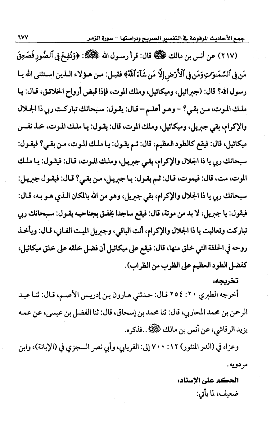 (217) عن أنس بن مالك -رضي الله عنه- قال: قرأ رسول الله -صلى الله عليه وسلم-: {وَنُفِخَ فِي الصُّورِ فَصَعِقَ مَنْ فِي السَّمَاوَاتِ وَمَنْ فِي الْأَرْضِ إِلا مَنْ شَاءَ اللَّهُ} فقيل: من هؤلاء الذين استثنى الله يا رسول الله؟ قال. (جبرائيل، وميكائيل، وملك الموت، فإذا قبض أرواح الخلائق، قال: با ملك الموت، من بقي؟ -وهو أعلم- قال: يقول: سبحانك تباركت ربي ذا الجلال والإكرام، بقي جبريل، وميكائيل، وملك الموت، قال: يقول: يا ملك الموت، خذ نفس ميكائيل، قال: فيقع كالطود العظيم، قال: ثم يقول: يا ملك الموت، من بقي؟ فيقول: سبحانك ربي يا ذا الجلال والإكرام، بقي جبريل، وملك الموت، قال: فيقول: يا ملك الموت، مت، قال: فيموت، قال: ثم يقول: يا جبربل، من بقي؟ قال: فيقول جبربل: سبحانك ربي يا ذا الجلال والإكرام، بقي جبريل، وهو من الله بالمكان الذي هو به، قال: فيقول: يا جبريل، لابد من موتة، قال: فيقع ساجدا يخفق بجناحيه يقول: سبحانك ربي تباركت وتعاليت يا ذا الجلال والإكرام، أنت الباقي، وجبربل الميت الفاني، قال: ويأخذ روحه في الحلقة التي خلق منها، قال: فيقع على ميكائيل أن فضل خلقه على خلق ميكائيل، كفضل الطود العظيم على الظرب من الظراب).