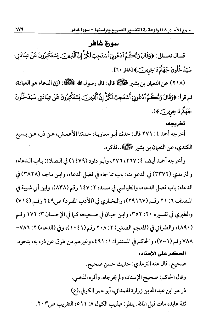 (218) عن النعمان بن بشير -رضي الله عنهما- قال: قال رسول الله -صلى الله عليه وسلم-: (إن الدعاء هو العبادة، ثم قرأ: {وَقَالَ رَبُّكُمُ ادْعُونِي أَسْتَجِبْ لَكُمْ إِنَّ الَّذِينَ يَسْتَكْبِرُونَ عَنْ عِبَادَتِي سَيَدْخُلُونَ جَهَنَّمَ دَاخِرِينَ}).