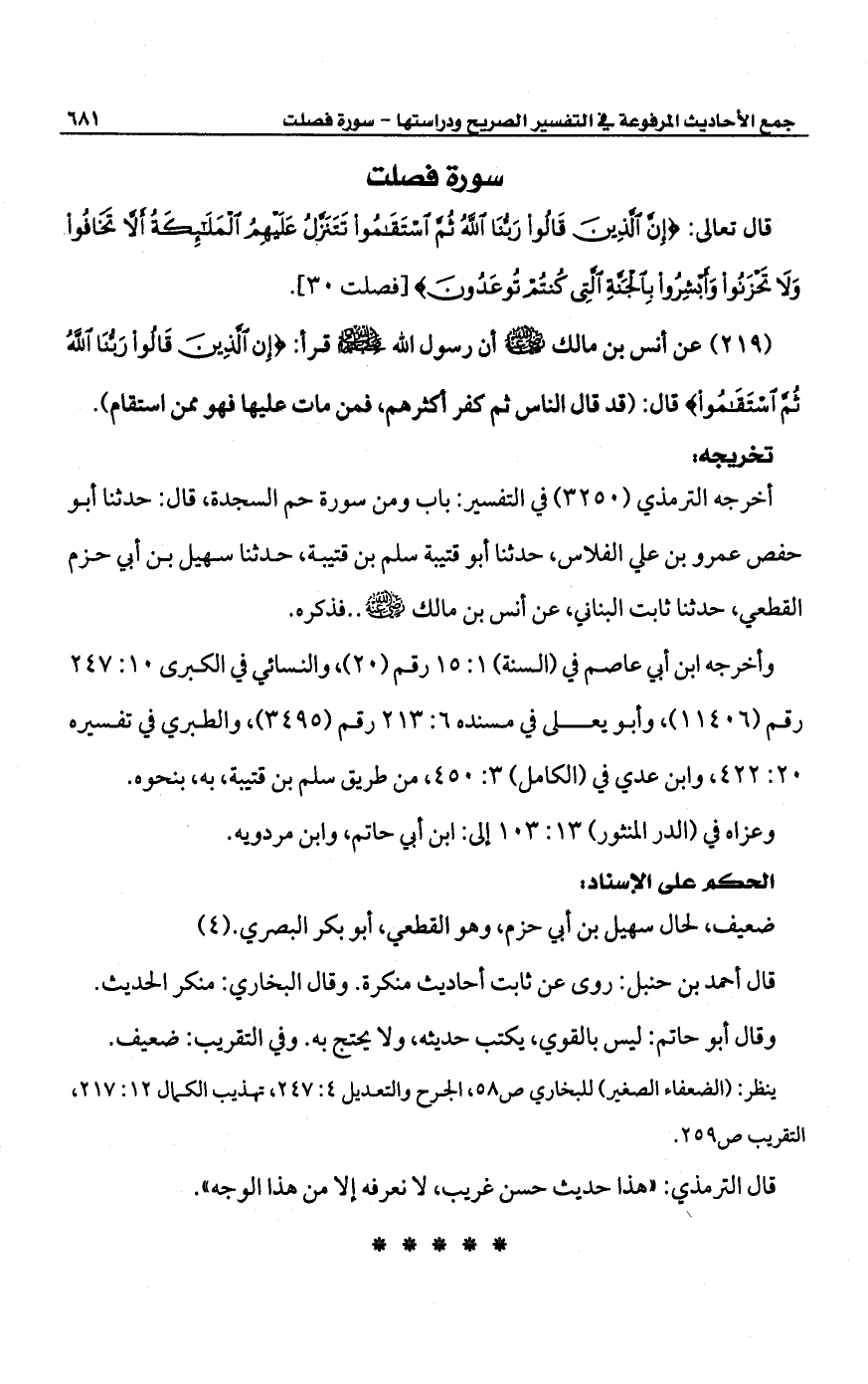 أخرجه الترمذي (3250) في التفسير: باب ومن سورة حم السجدة، قال: حدثنا أبو حفص عمرو بن علي الفلاس، حدثنا أبو قتيبة سلم بن قتيبة، حدثنا سهيل بن أبي حزم القطعي، حدثنا ثابت البناني، عن أنس بن مالك -رضي الله عنه- .. فذكره.