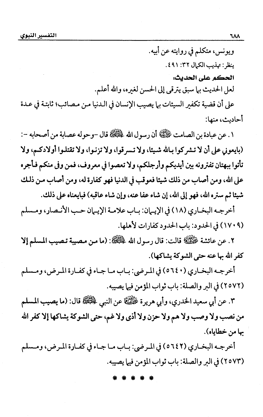 1 - عن عبادة بن الصامت -رضي الله عنه- أن رسول الله -صلى الله عليه وسلم- قال -وحوله عصابة من أصحابه-: (بايعوني على أن لا تشركوا بالله شيئا، ولا تسرقوا، ولا تزنوا، ولا تقتلوا أولادكم، ولا تأتوا ببهتان تفترونه بين أيديكم وأرجلكم، ولا تعصوا في معروف، فمن وفى منكم فأجره على الله، ومن أصاب من ذلك شيئا فعوقب في الدنيا فهو كفارة له، ومن أصاب من ذلك شيئا ثم ستره الله، فهو إلى الله، إن شاء عفا عنه، وإن شاء عاقبه) فبايعناه على ذلك.
