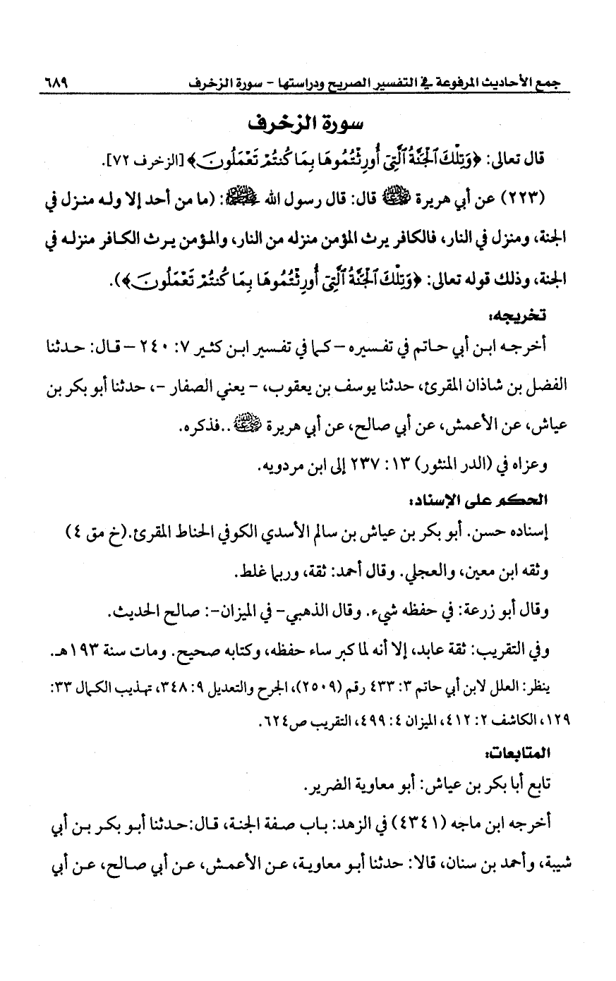 أخرجه ابن أبي حاتم في تفسيره -كما في تفسير ابن كثير 7: 240 - قال: حدثنا الفضل بن شاذان المقرىء، حدثنا يوسف بن يعقوب -يعني الصفار-، حدثنا أبو بكر بن عياش، عن الأعمش، عن أبي صالح، عن أبي هريرة -رضي الله عنه- .. فذكره.