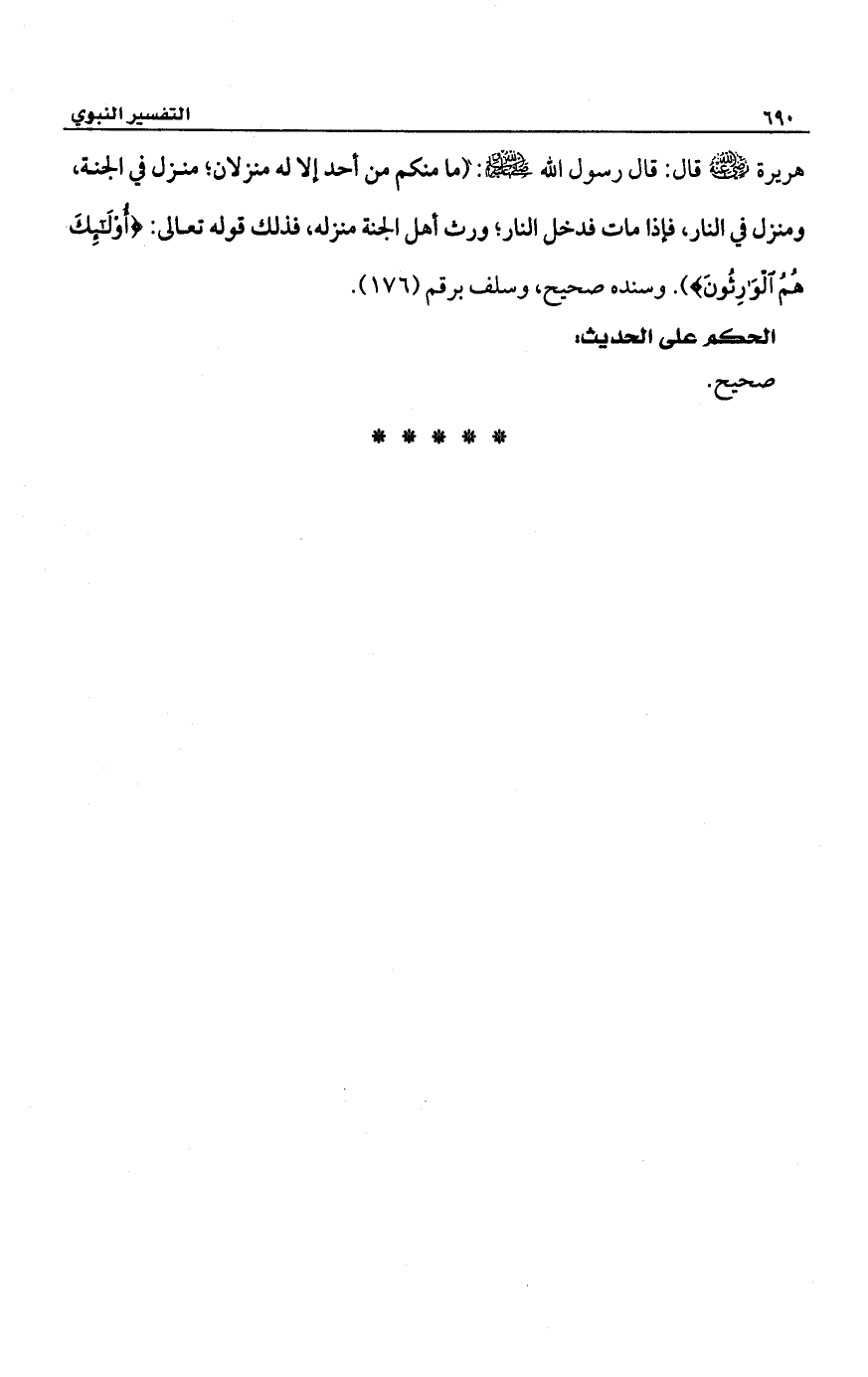 هريرة -رضي الله عنه- قال: قال رسول الله -صلى الله عليه وسلم-: (ما منكم من أحد إلا له منزلان؛ منزل في الجنة، ومنزل في النار، فإذا مات فدخل النار؛ ورث أهل الجنة منزله، فذلك قوله تعالى: {أُولَئِكَ هُمُ الْوَارِثُونَ}. وسنده صحيح، وسلف برقم (176).