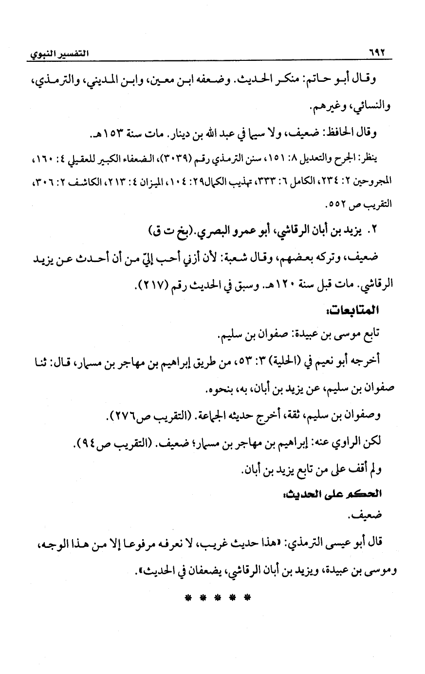 ينظر: الجرح والتعديل 8: 151، سنن الترمذي رقم (3039)، الضعفاء الكبير للعقيلي 4: 160، المجروحين 2: 234، الكامل 6: 333، تهذيب الكمال 29: 104، الميزان 4: 213، الكاشف 2: 306، التقريب ص 552.