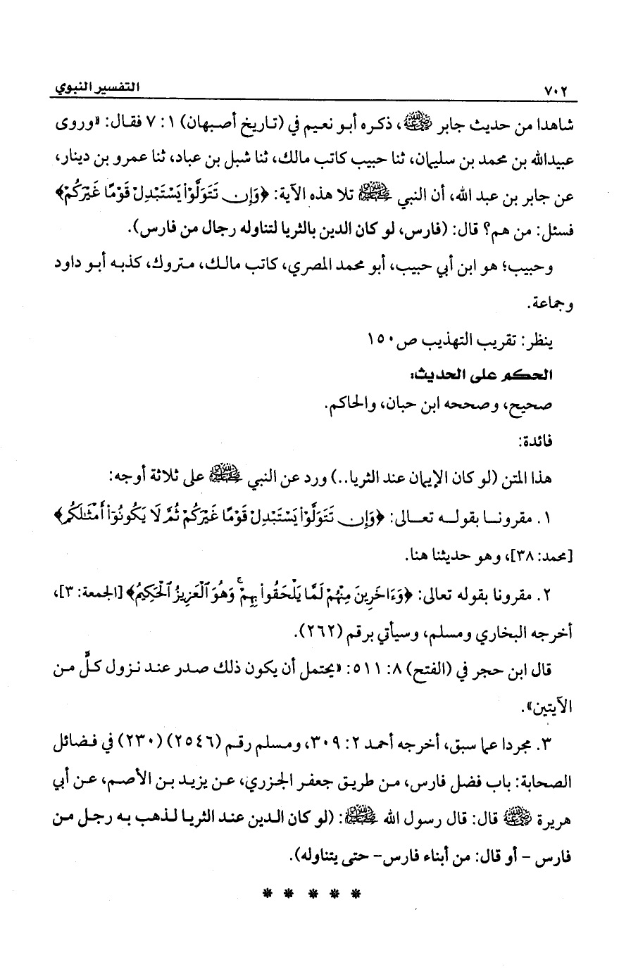 شاهدا من حديث جابر -رضي الله عنه-، ذكره أبو نعيم في (تاريخ أصبهان) 1: 7 فقال: "وروى عبيد الله بن محمد بن سليمان، ثنا حبيب كاتب مالك، ثنا شبل بن عباد، ثنا عمرو بن دينار، عن جابر بن عبد الله، أن النبي -صلى الله عليه وسلم- تلا هذه الاَية: {وَإِنْ تَتَوَلَّوْا يَسْتَبْدِلْ قَوْمًا غَيْرَكُمْ} فسئل: من هم؟ قال: (فارس، لو كان الدين بالثريا لتناوله رجال من فارس).