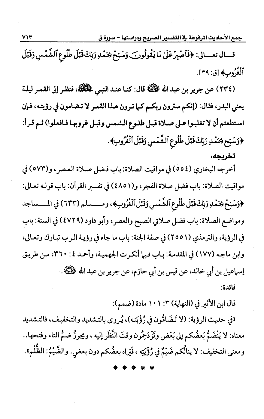 (234) عن جرير بن عبد الله -رضي الله عنه- قال: كنا عند النبي -صلى الله عليه وسلم-، فنظر إلى القمر ليلة يعني البدر، فقال: (إِنكم سترون ربكم كما ترون هذا القمر لا تضامون في رؤيته، فإن استطعتم أن لا تغلبوا على صلاة قبل طلوع الشمس وقبل غروبها فافعلوا) ثم قرأ: {وَسَبِّحْ بِحَمْدِ رَبِّكَ قَبْلَ طُلُوعِ الشَّمْسِ وَقَبْلَ الْغُرُوبِ}.