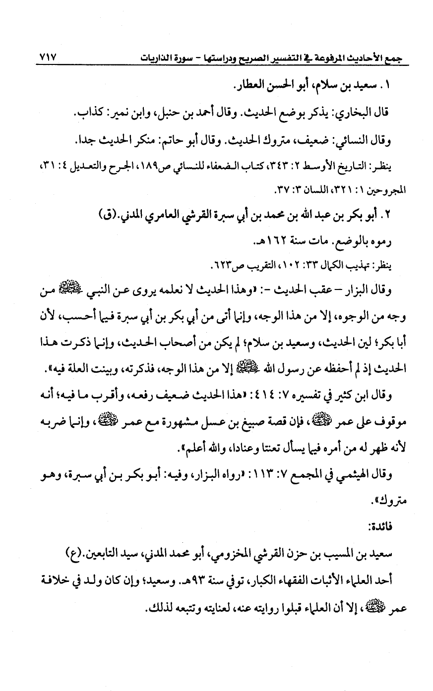 وقال ابن كثير في تفسيره 7: 414: "هذا الحديث ضعيف رفعه، وأقرب ما فيه؛ أنه موقوف على عمر -رضي الله عنه-، فإن قصة صبيغ بن عسل مشهورة مع عمر -رضي الله عنه-، وإنما ضربه لأنه ظهر له من أمره فيما يسأل تعنتا وعنادا، والله أعلم".