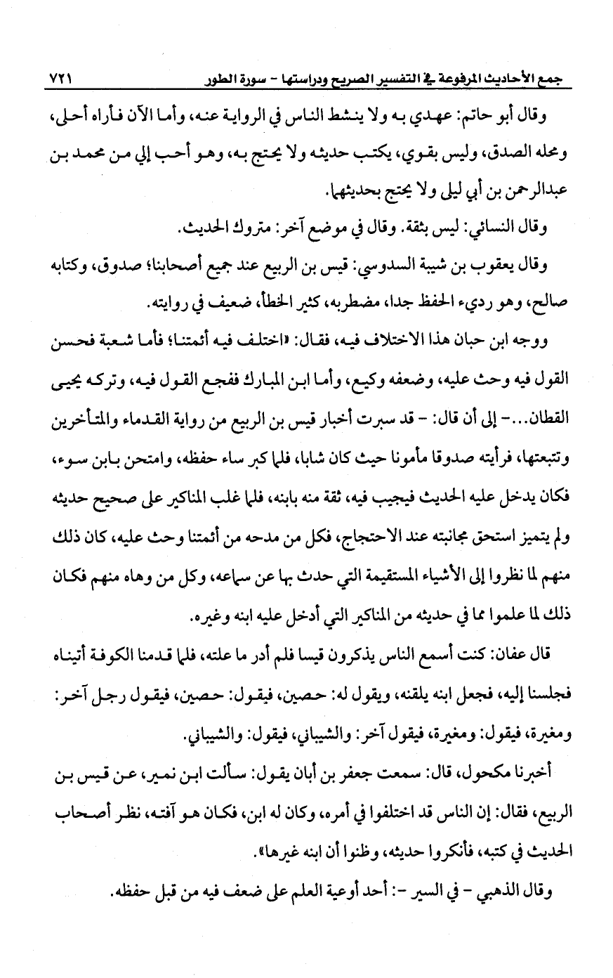ووجه ابن حبان هذا الاختلاف فيه، فقال: "اختلف فيه أئمتنا؛ فأما شعبة فحسن القول فيه وحث عليه، وضعفه وكيع، وأما ابن المبارك ففجع القول فيه، وتركه يحيى القطان ... -إلى أن قال:- قد سبرت أخبار قيس بن الربيع من رواية القدماء والمتأخرين وتتبعتها، فرأيته صدوقا مأمونا حيث كان شابا، فلما كبر ساء حفظه، وامتحن بابن سوء، فكان يدخل عليه الحديث فيجيب فيه، ثقة منه بابنه، فلما غلب المناكير على صحيح حديثه ولم يتميز استحق مجانبته عند الاحتجاج، فكل من مدحه من أئمتنا وحث عليه، كان ذلك منهم لما نظروا إلى الأشياء المستقيمة التي حدث بها عن سماعه، وكل من وهاه منهم فكان ذلك لما علموا مما في حديثه من المناكير التي أدخل عليه ابنه وغيره.