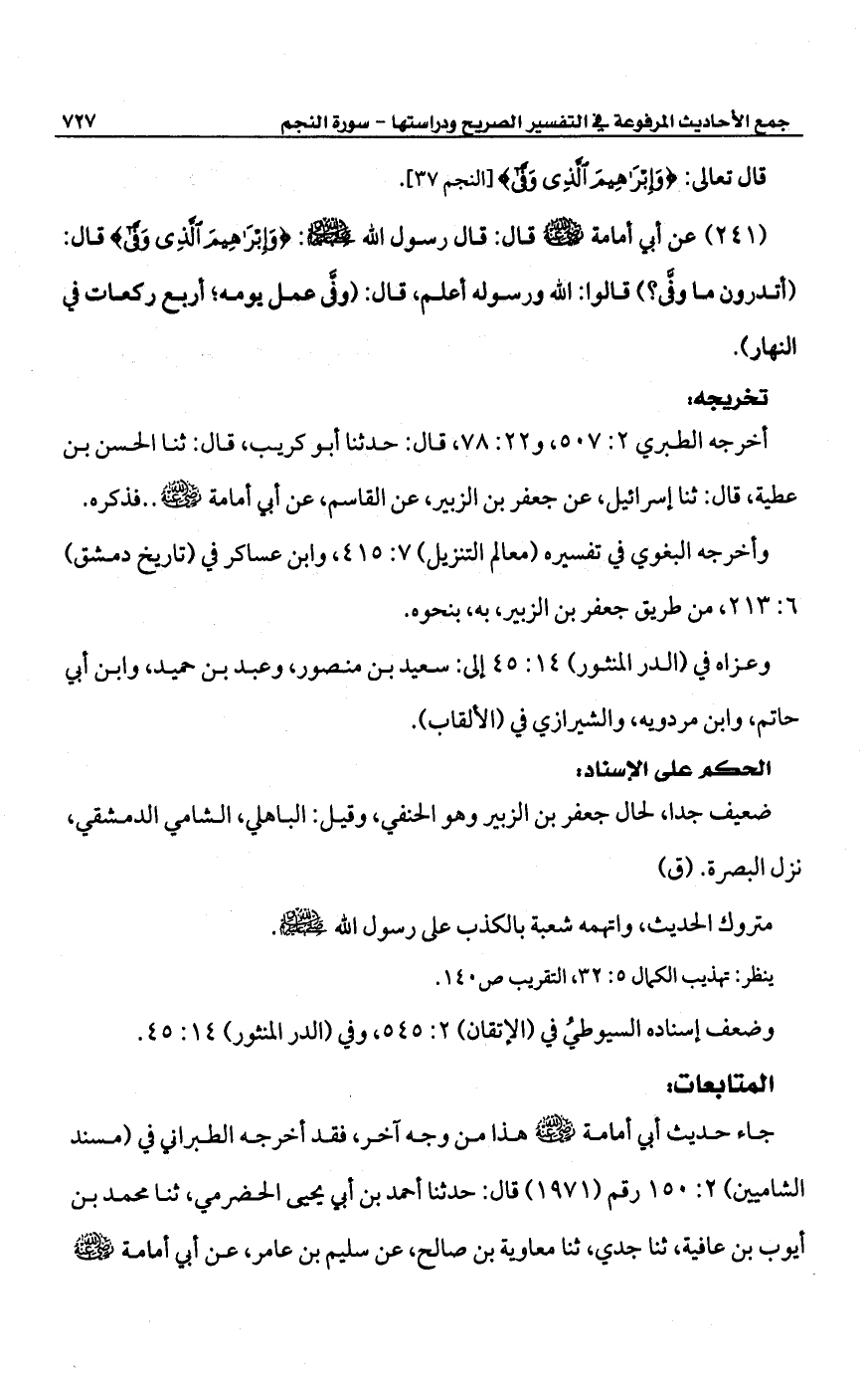 (241) عن أبي أمامة -رضي الله عنه- قال: قال رسول الله -صلى الله عليه وسلم-: {وَإِبْرَاهِيمَ الَّذِي وَفَّى} قال: (أتدرون ما وفَّى؟) قالوا: الله ورسوله أعلم، قال: (وفَّى عمل يومه؛ أربع ركعات في النهار).