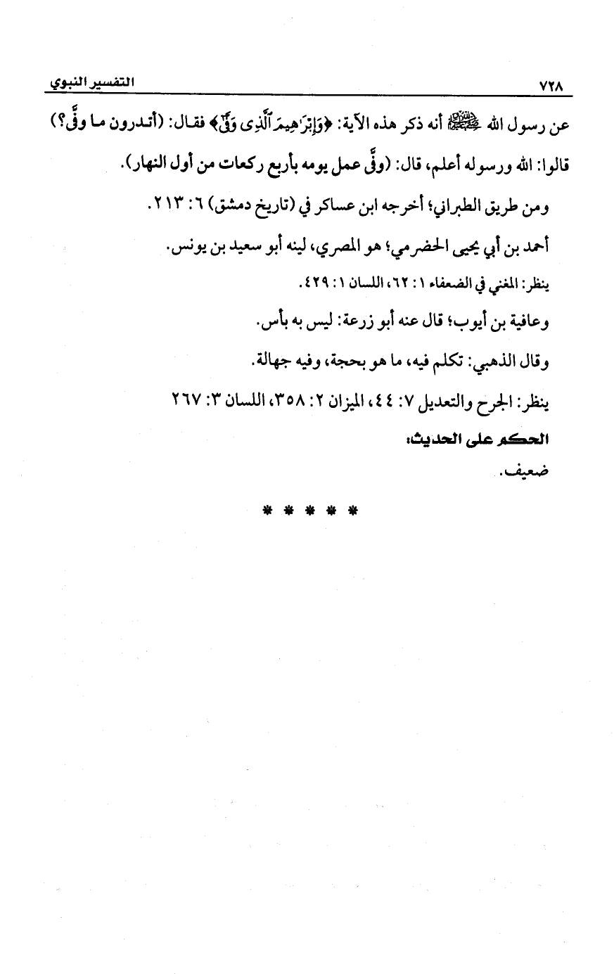 عن رسول الله -صلى الله عليه وسلم- أنه ذكر هذه الآية: {وَإِبْرَاهِيمَ الَّذِي وَفَّى} فقال: (أتدرون ما وفَّى؟) قالوا: الله ورسوله أعلم، قال: (وفَّى عمل يومه بأربع ركعات من أول النهار).