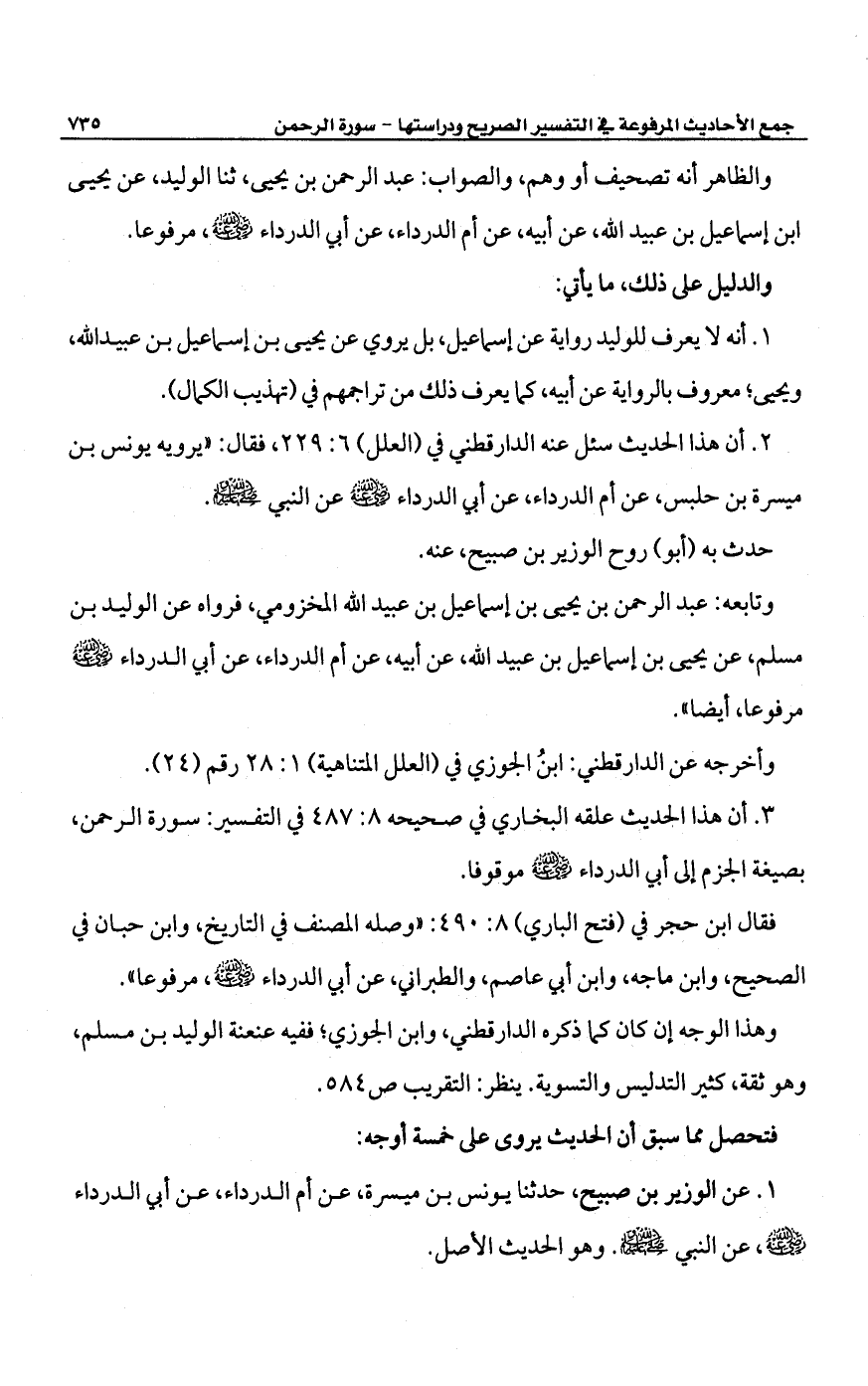 2 - أن هذا الحديث سئل عنه الدارقطني في (العلل) 6: 229، فقال: "يرويه يونس بن ميسرة بن حلبس، عن أم الدرداء، عن أبي الدرداء -رضي الله عنه- عن النبي -صلى الله عليه وسلم-.