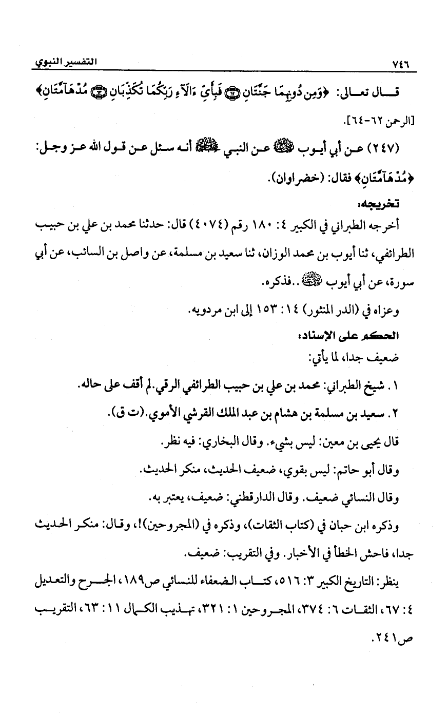 (247) عن أبي أيوب -رضي الله عنه- عن النبي -صلى الله عليه وسلم- أنه سئل عن قول الله عز وجل: {مُدْهَامَّتَانِ} فقال: (خضراوان).