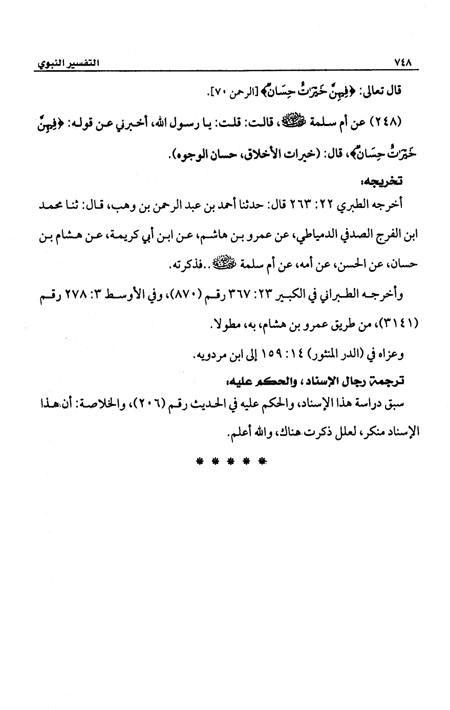 (248) عن أم سلمة -رضي الله عنها-، قالت: قلت: يا رسول الله، أخبرني عن قوله: {فِيهِنَّ خَيْرَاتٌ حِسَانٌ}، قال: (خيرات الأخلاق، حسان الوجوه).