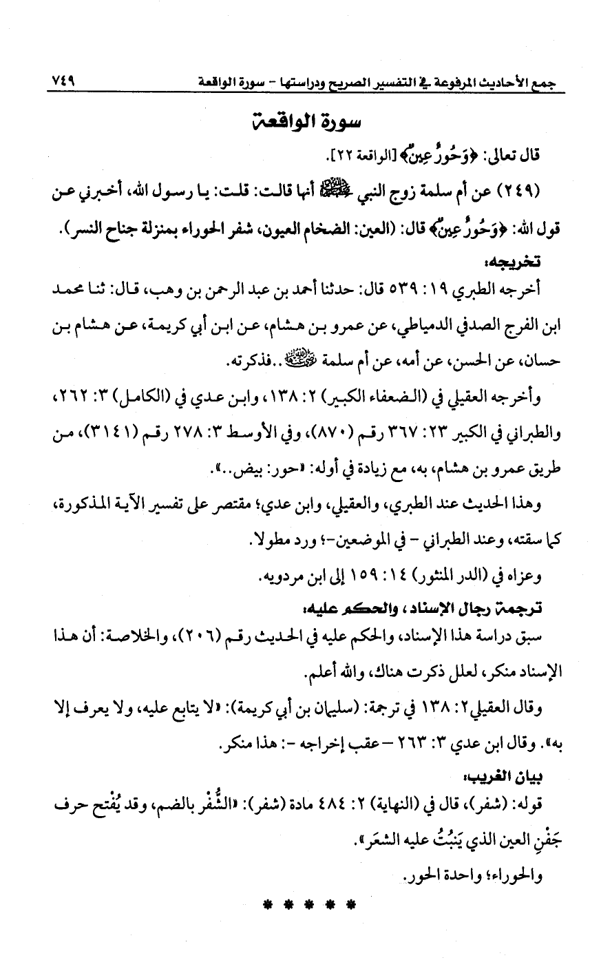 (249) عن أم سلمة زوج النبي -صلى الله عليه وسلم- أنها قالت: قلت: يا رسول الله، أخبرني عن قول الله: {وَحُورٌ عِينٌ} قال: (العين: الضخام العيون، شفر الحوراء بمنزلة جناح النسر).