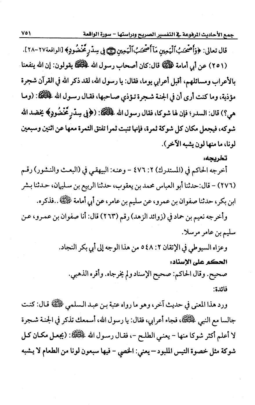 (251) عن أبي أمامة -رضي الله عنه- قال: كان أصحاب رسول الله -صلى الله عليه وسلم- يقولون: إن الله ينفعنا. بالأعراب ومسائلهم، أقبل أعرابي يوما، فقال: يا رسول الله، لقد ذكر الله في القرآن شجرة مؤذية، وما كنت أرى أن في الجنة شجرة تؤذي صاحبها، فقال رسول الله -صلى الله عليه وسلم-: (وما هي؟) قال: السدر؛ فإن لها شوكا، فقال رسول الله -صلى الله عليه وسلم-: {فِي سِدْرٍ مَخْضُودٍ} يخضد الله شوكه، فيجعل مكان كل شوكة ثمرة، فإنها تنبت ثمرا تفتق الثمرة معها عن اثنين وسبعين لونا، ما منها لون يشبه الآخر).