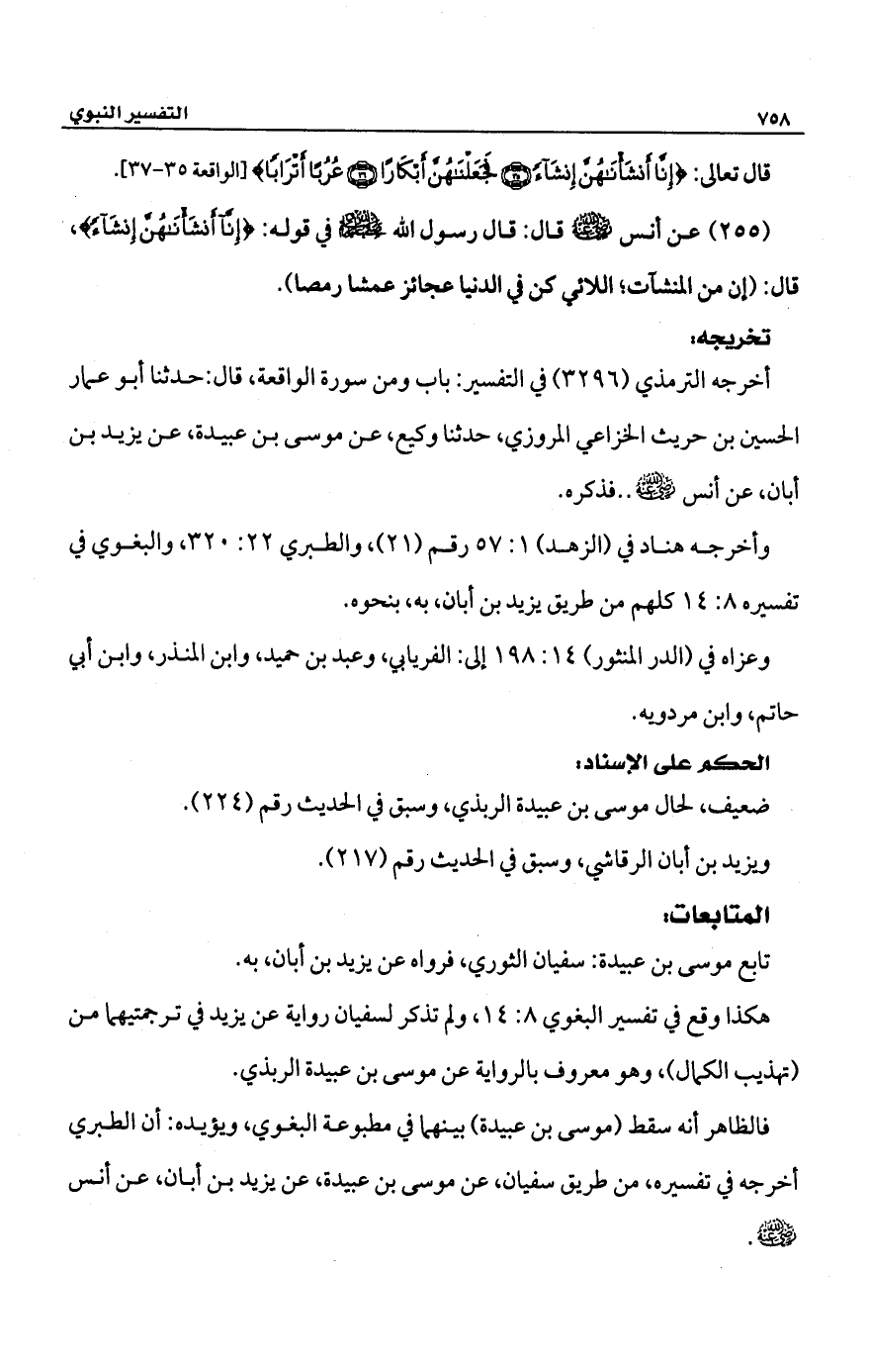 (255) عن أنس -رضي الله عنه- قال: قال رسول الله -صلى الله عليه وسلم- في قوله: {أَنْشَأْنَاهُنَّ إِنْشَاءً}، قال: (إن من المنشآت؛ اللائي كن في الدنيا عجائز عمشا رمصا).