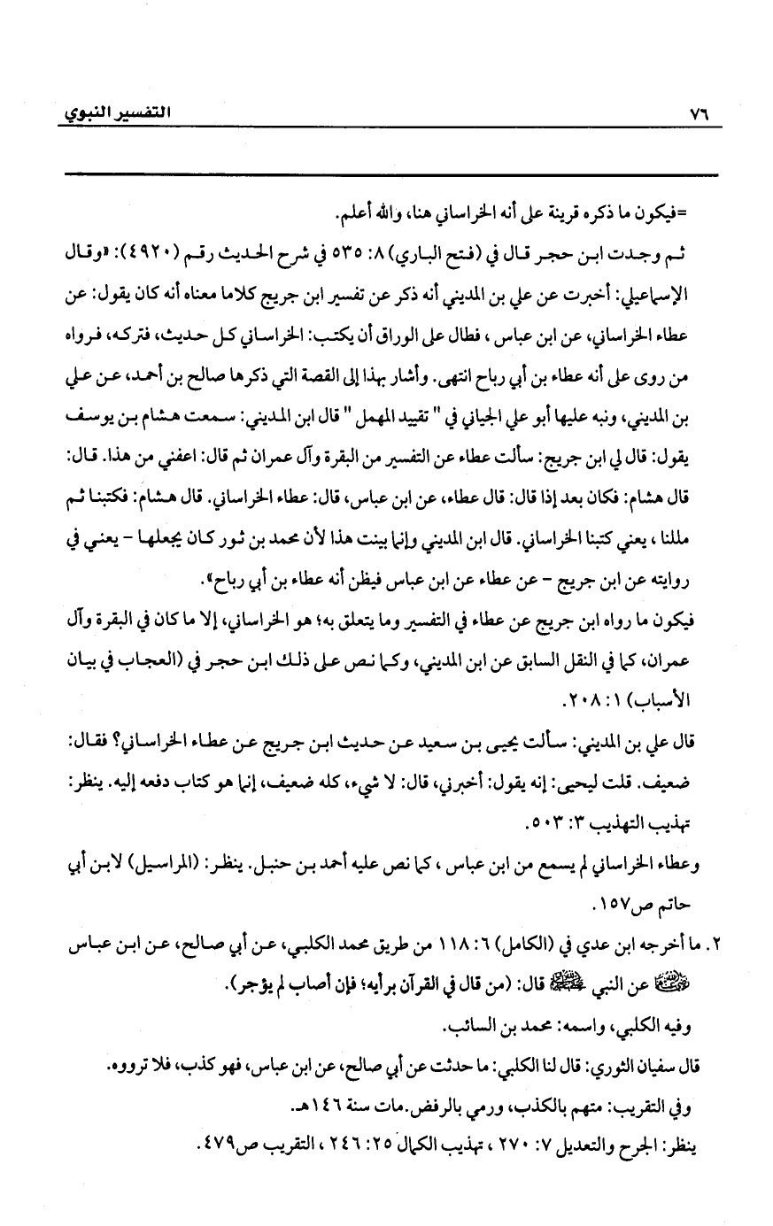 2 - ما أخرجه ابن عدي في (الكامل) 6: 118 من طريق محمد الكلبي، عن أبي صالح، عن ابن عباس -رضي الله عنهما-. عن النبي -صلى الله عليه وسلم- قال: (من قال في القرآن برأيه؛ فإن أصاب لم يؤجر).