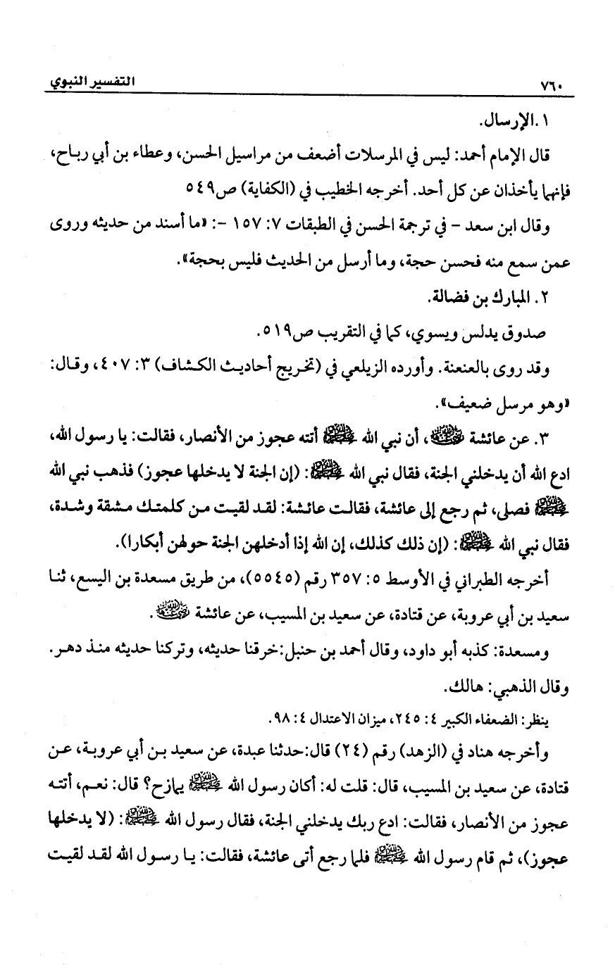 وأخرجه هناد في (الزهد) رقم (24) قال: حدثنا عبدة، عن سعيد بن أبي عروبة، عن قتادة، عن سعيد بن المسيب، قال: قلت له: أكان رسول الله -صلى الله عليه وسلم- يمازح؟ قال: نعم، أتته عجوز من الأنصار، فقالت: ادع ربك يدخلني الجنة، فقال رسول الله -صلى الله عليه وسلم-: (لا يدخلها عجوز)، ثم قام رسول الله -صلى الله عليه وسلم- فلما رجع أتى عائشة، فقالت: يا رسول الله لقد لقيت