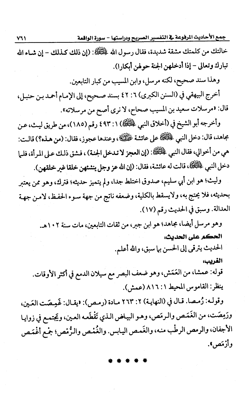 وأخرجه أبو الشيخ في (أخلاق النبي -صلى الله عليه وسلم-) 1: 493 رقم (185)، من طريق ليث، عن مجاهد، قال: دخل النبي -صلى الله عليه وسلم- على عائشة -رضي الله عنها-، وعندها عجوز، فقال: (من هذه؟) قالت: هي من أخوالي، فقال النبي -صلى الله عليه وسلم-: (إن العجز لا تدخل الجنة)، فشق ذلك على المرأة، فلما دخل النبي -صلى الله عليه وسلم-، قالت له عائشة، فقال: (إن الله عز وجل ينشئهن خلقا غير خلقهن).