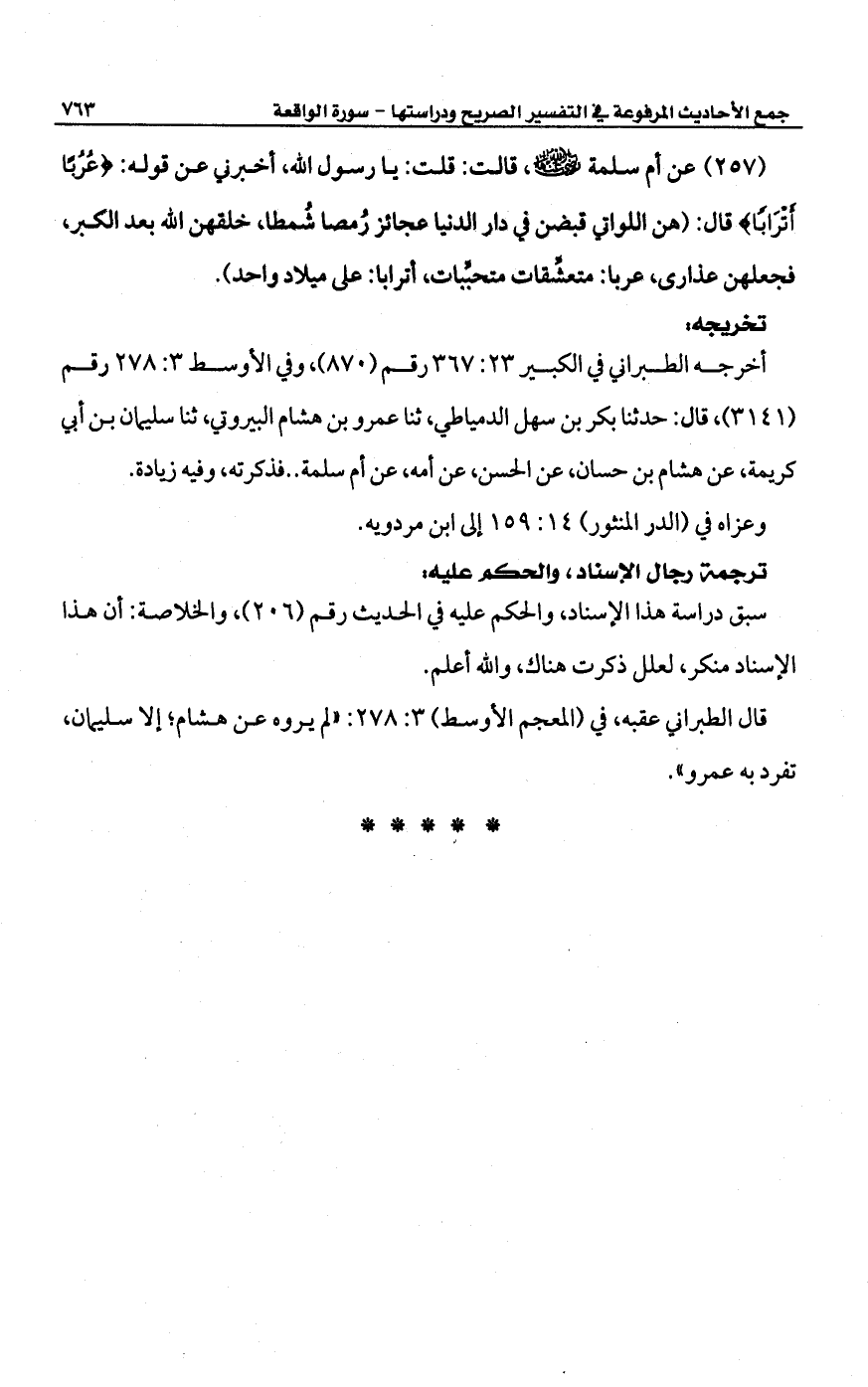 (257) عن أم سلمة -رضي الله عنها-، قالت: قلت: يا رسول الله، أخبرني عن قوله: {عُرُبًا أَتْرَابًا} قال: (هن اللواتي قبضن في دار الدنيا عجائز رُمصا شُمطا، خلقهن الله بعد الكبر، فجعلهن عذارى، عربا: متعشِّقات متحبِّبات، أترابا: على ميلاد واحد).