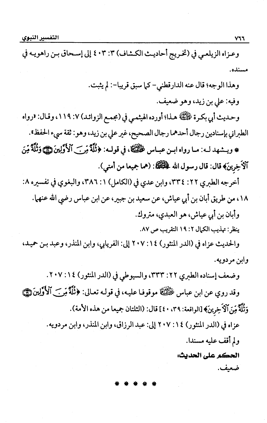 وقد روي عن ابن عباس -رضي الله عنهما- موقوفا عليه، في قوله تعالى: {ثُلَّةٌ مِنَ الْأَوَّلِينَ (39) وَثُلَّةٌ مِنَ الْآخِرِينَ (40)} [الواقعة: 39، 40] قال: (الثلتان جميعا من هذه الأمة).