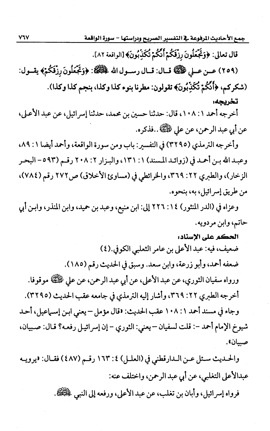 (259) عن علي -رضي الله عنه- قال: قال رسول الله -صلى الله عليه وسلم-: {وَتَجْعَلُونَ رِزْقَكُمْ} يقول: (شكركم، {أَنَّكُمْ تُكَذِّبُونَ} تقولون: مطرنا بنوء كذا وكذا، بنجم كذا وكذا).