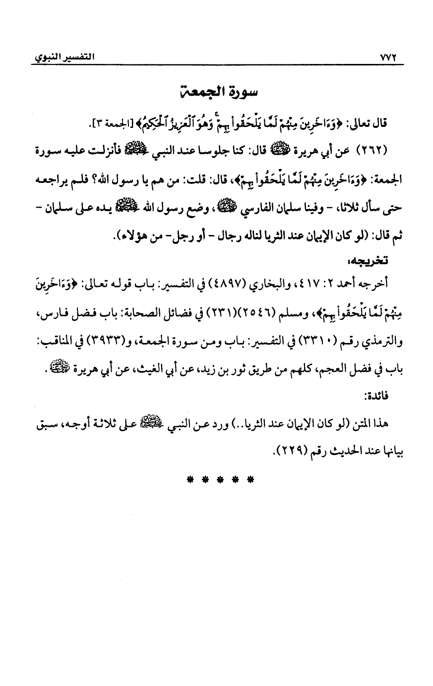(262) عن أبي هريرة -رضي الله عنه- قال: كنا جلوسا عند النبي -صلى الله عليه وسلم- فأنزلت عليه سورة الجمعة: {وَآخَرِينَ مِنْهُمْ لَمَّا يَلْحَقُوا بِهِمْ} قال: قلت: من هم يا رسول الله؟ فلم يراجعه حتى سأل ثلاثا، -وفينا سلمان الفارسي -رضي الله عنه-، وضع رسول الله -صلى الله عليه وسلم- يده على سلمان- ثم قال: (لو كان الإيمان عند الثريا لناله رجال -أو رجل- من هؤلاء).
