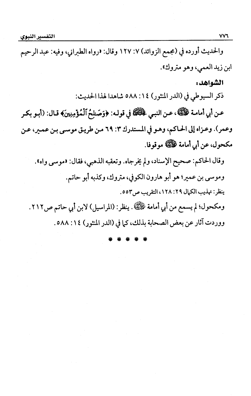 عن أبي أمامة -رضي الله عنه-، عن النبي -صلى الله عليه وسلم- في قوله: {وَصَالِحُ الْمُؤْمِنِينَ} قال: (أبو بكر وعمر). وعزاه إلى الحاكم، وهو في المستدرك 3: 69 من طريق موسى بن عمير، عن مكحول، عن أبي أمامة -رضي الله عنه- موقوفا.