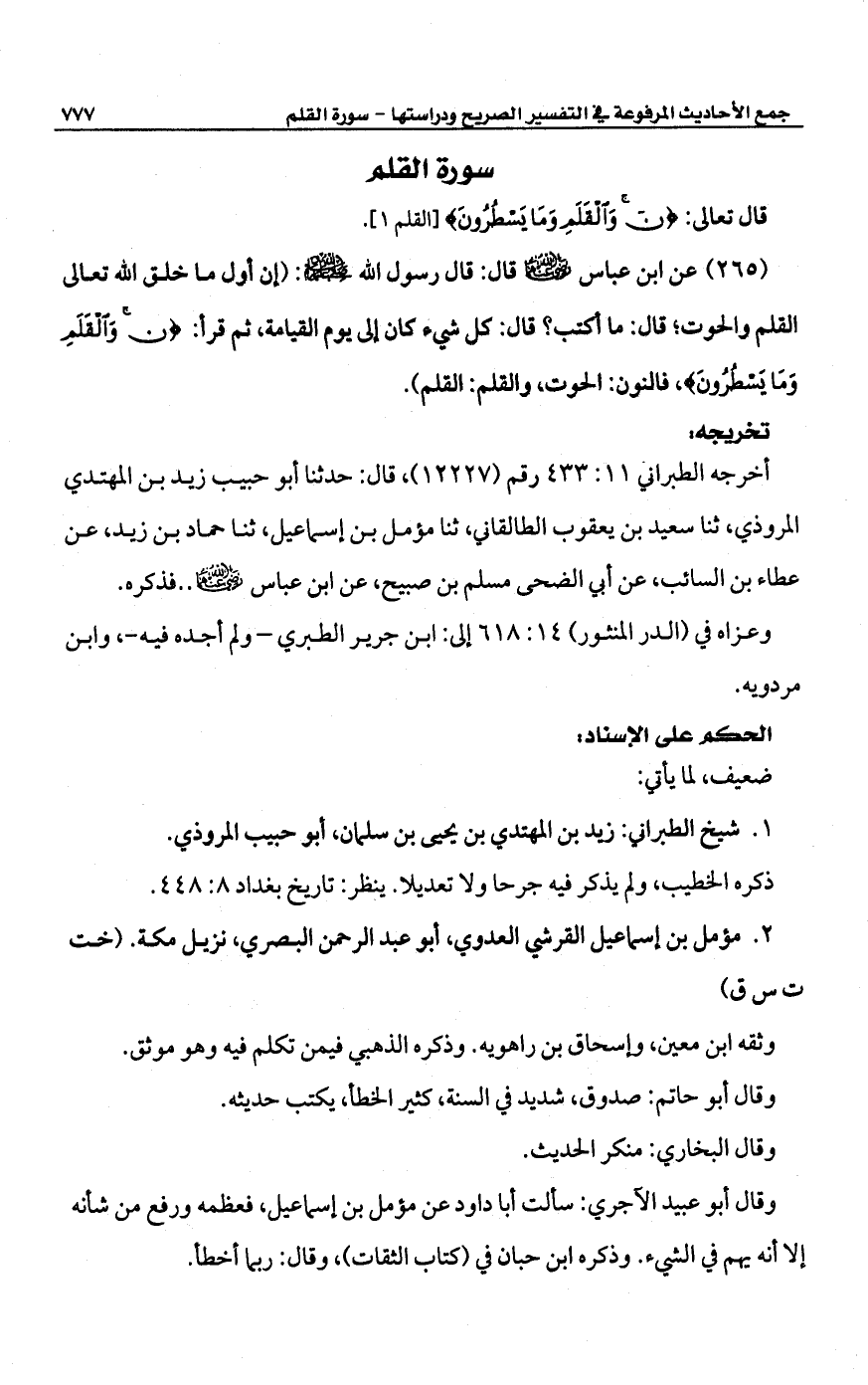 (265) عن ابن عباس -رضي الله عنهما- قال: قال رسول الله -صلى الله عليه وسلم-: (أن أول ما خلق الله تعالى القلم والحوت؛ قال: ما أكتب؟ قال: كل شيء كان إلى يوم القيامة، ثم قرأ: {ن وَالْقَلَمِ وَمَا يَسْطُرُونَ (1)}، فالنون: الحوت، والقلم: القلم).