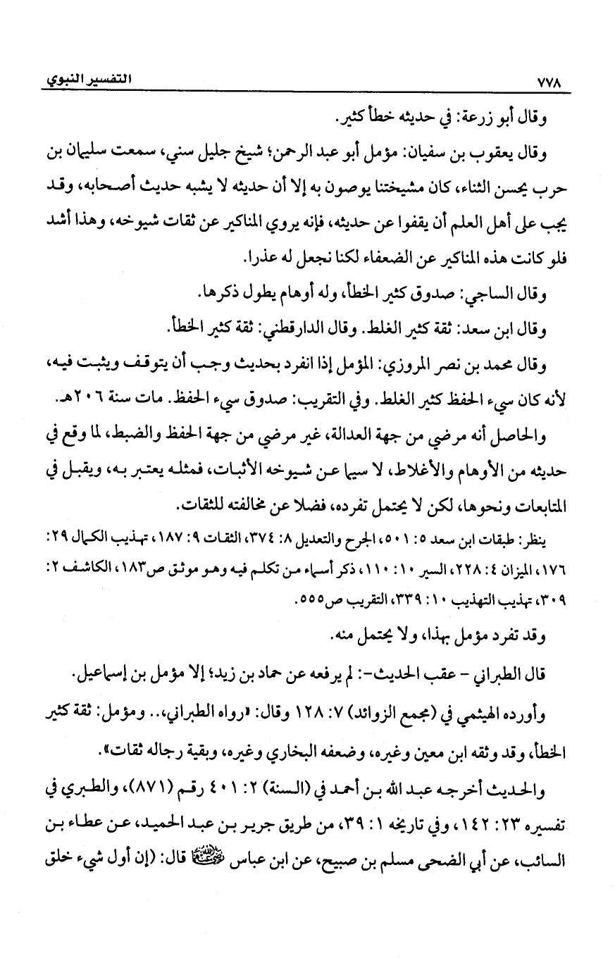 وأورده الهيثمي في (مجمع الزوائد) 7: 128 وقال: "رواه الطبراني، .. ومؤمل: ثقة كثير الخطأ، وقد وثقه ابن معين وغيره، وضعفه البخاري وغيره، وبقية رجاله ثقات".