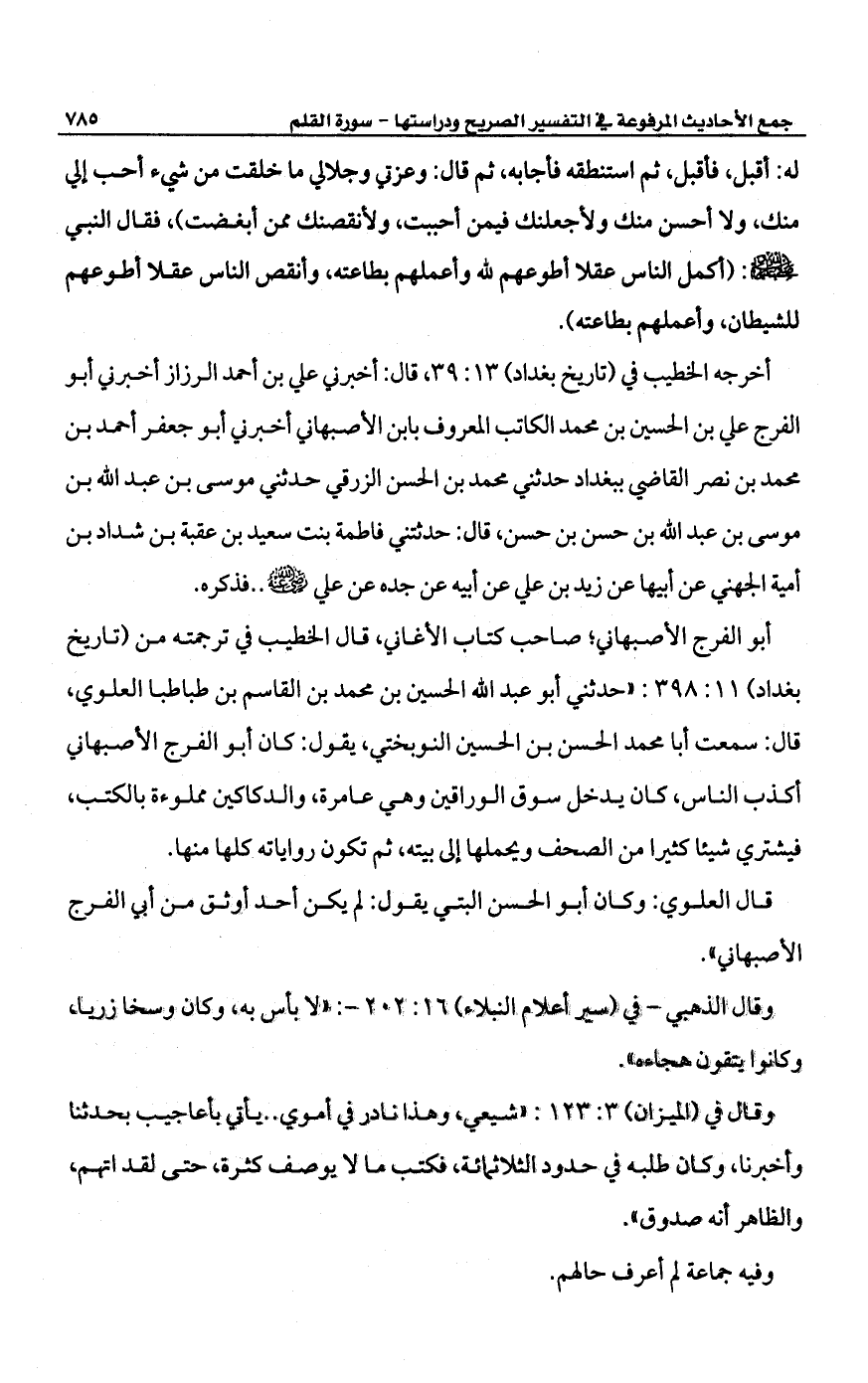 قال العلوي: وكان أبو الحسن البتي يقول: لم يكن أحد أوثق من أبي الفرج الأصبهاني".