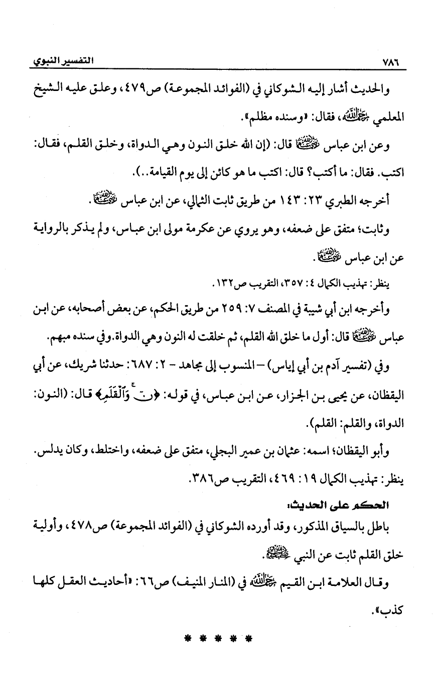 وفي (تفسير آدم بن أبي إياس) -المنسوب إلى مجاهد- 2: 687: حدثنا شريك، عن أبي اليقظان، عن يحيى بن الجزار، عن ابن عباس، في قوله: {ن وَالْقَلَمِ} قال: (النون: الدواة، والقلم: القلم).