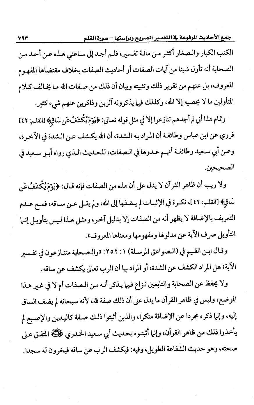 وقال ابن القيم في (الصواعق المرسلة) 1: 252: "والصحابة. متنازعون في تفسير الآية؛ هل المراد الكشف عن الشدة، أو المراد بها أن الرب تعالى يكشف عن ساقه.