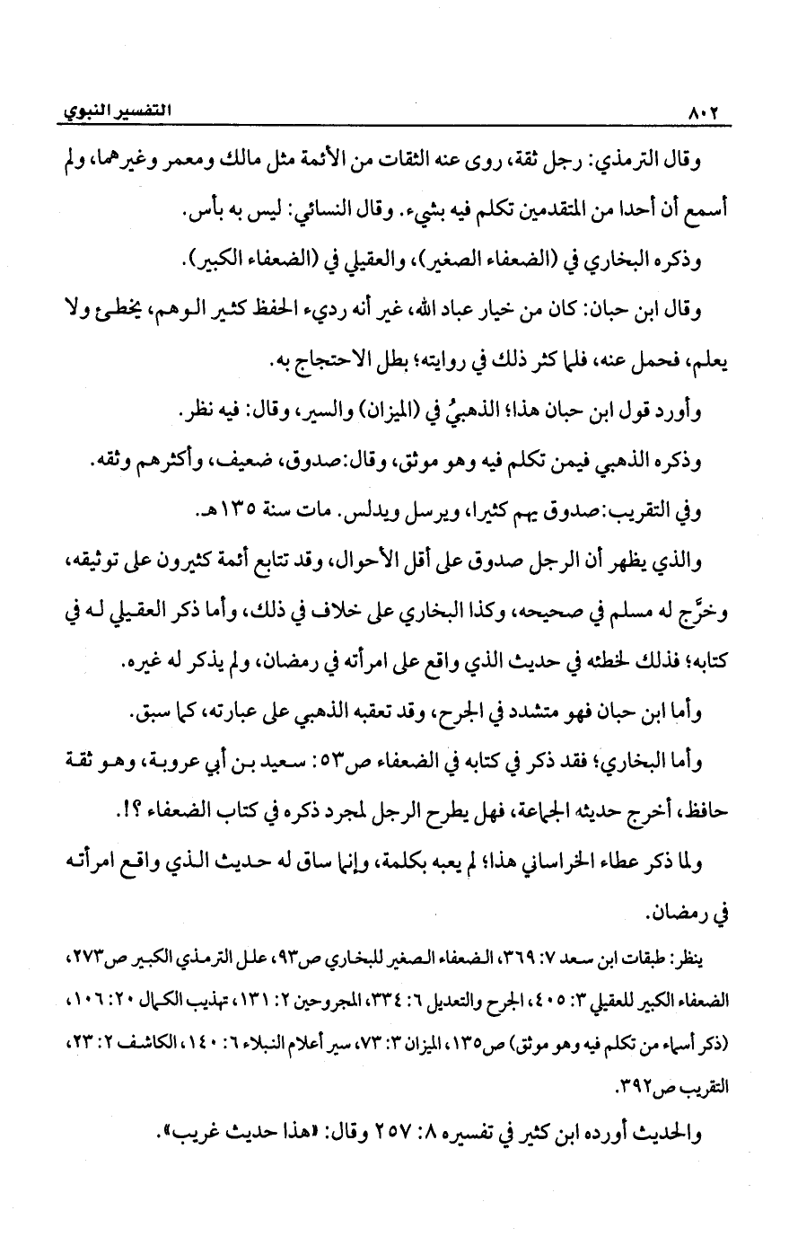 وأما البخاري؛ فقد ذكر في كتابه في الضعفاء ص 53: سعيد بن أبي عروبة، وهو ثقة حافظ، أخرج حديثه الجماعة، فهل يطرح الرجل لمجرد ذكره في كتاب الضعفاء؟!.