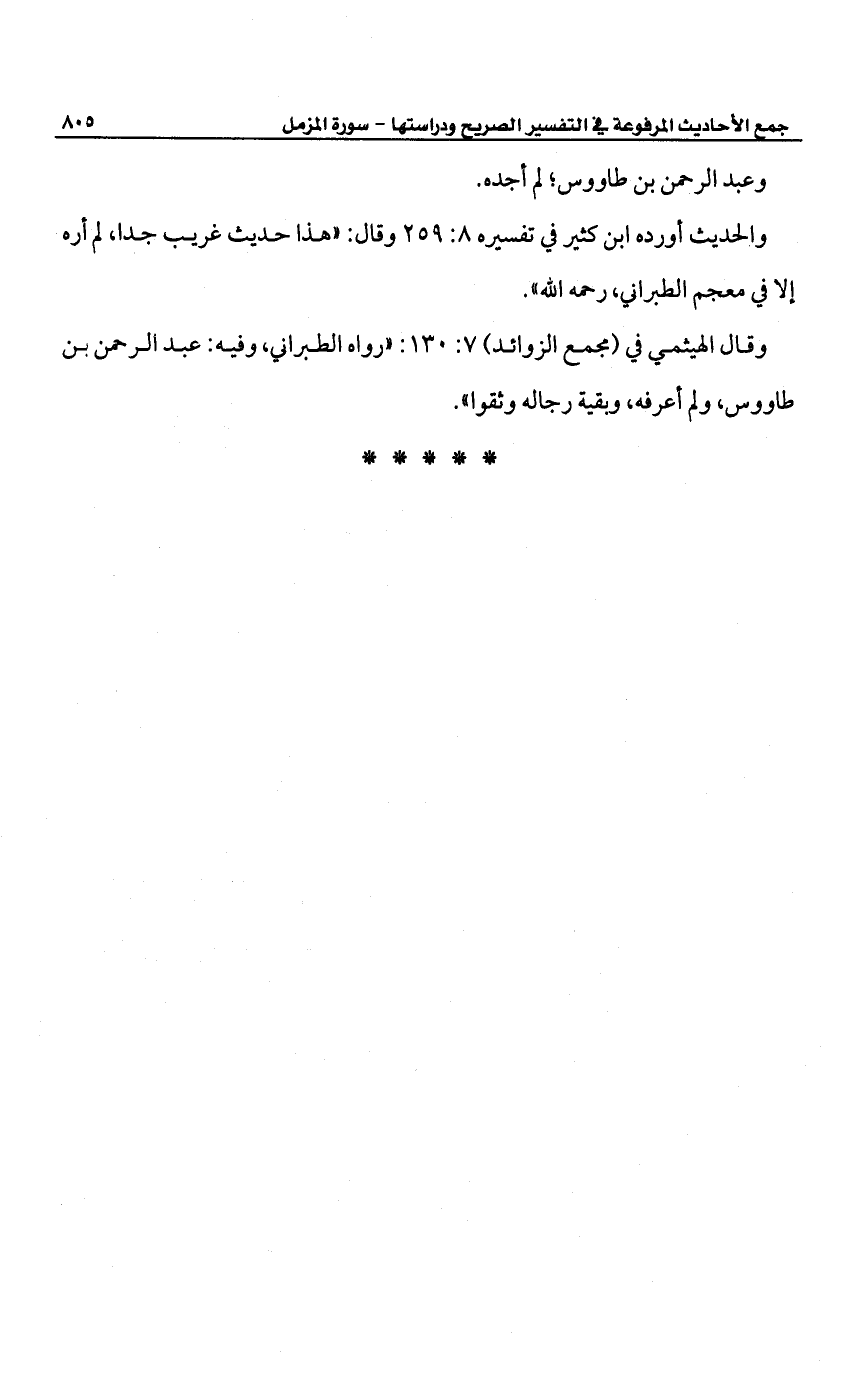 وقال الهيثمي في (مجمع الزوائد) 130:7: "رواه الطبراني، وفيه: عبد الرحمن بن طاووس، ولم أعرفه، وبقية رجاله وثقوا".